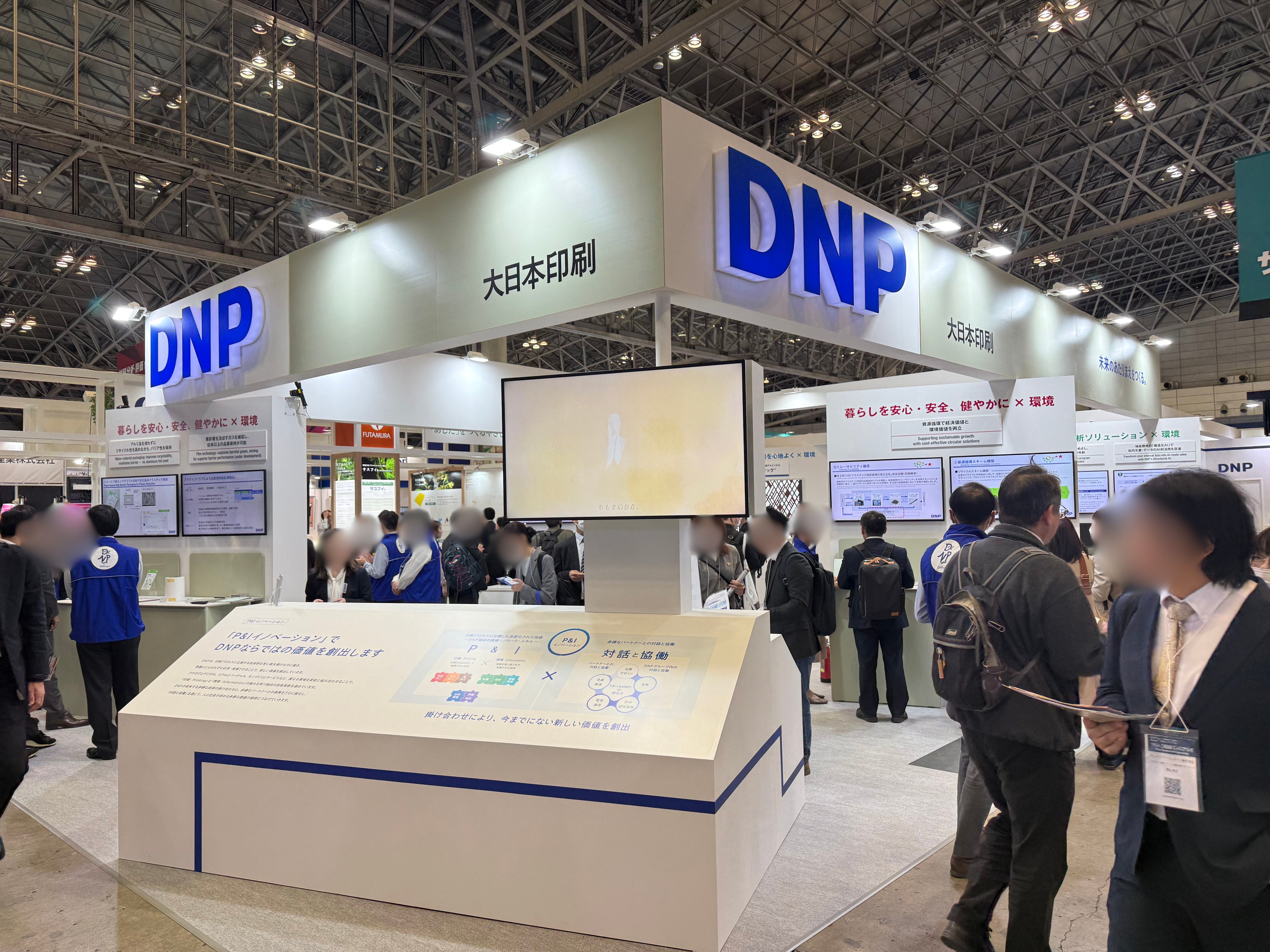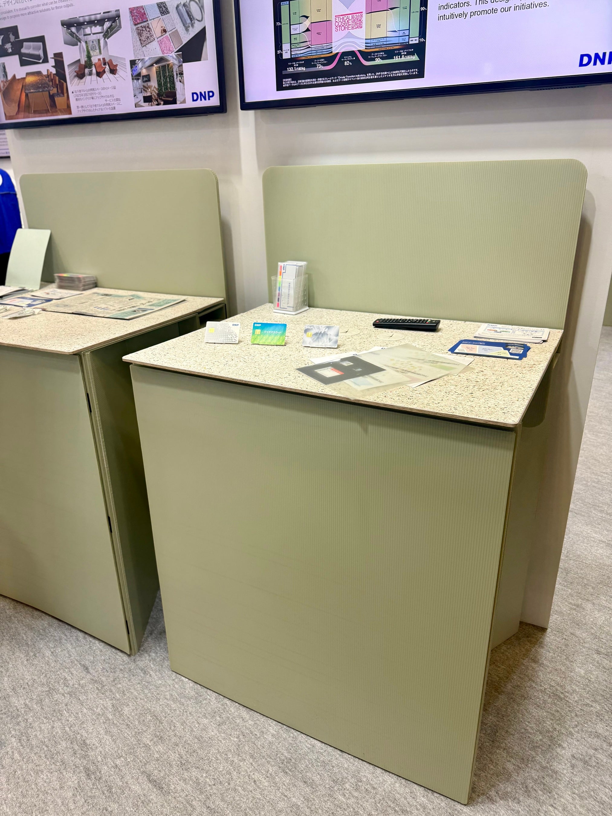 DNP様ブースでは、2024年10月に締結した資本業務提携のもと、サプライチェーン全体でのCO2排出量の削減や複合プラスチック由来のリサイクル材を活用した製品開発を両社でさらに推進していく方針を紹介し、施工や展示什器の一部には当社との連携により再生素材化した、自社工場から排出されたプラスチック廃材を原料とするリサイクル板材が採用されました。