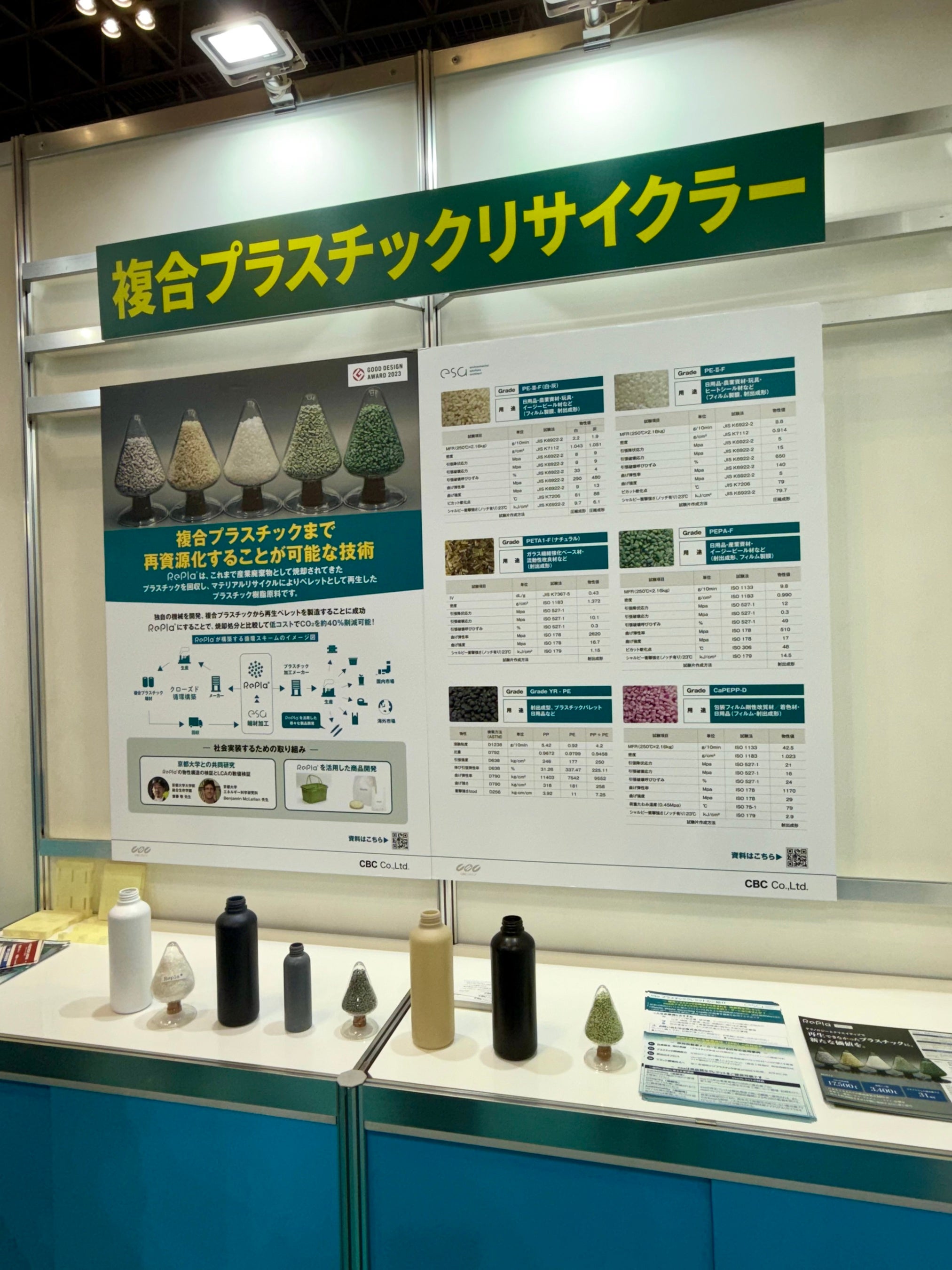当社はDNP様およびCBC様のブースに協力し、独自技術「esa method」により開発した複合材をリサイクルした再生プラスチックペレット「Repla」の実物サンプルや技術資料を展示しました。