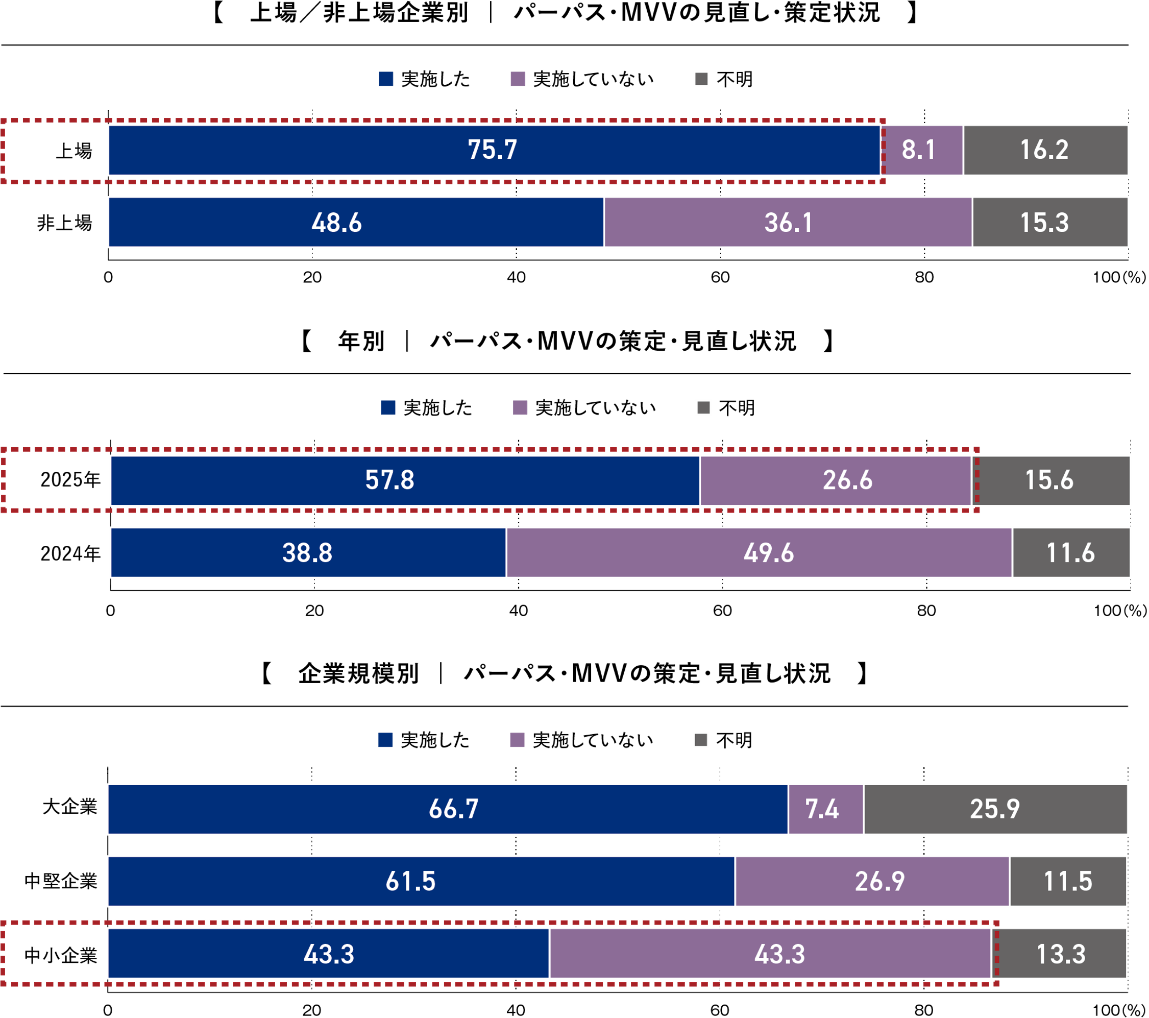 (3) パーパス・MVV(ミッション・ビジョン・バリュー)の見直し・策定率は大幅上昇! 特に上場・大企業での取り組みが先行しております。