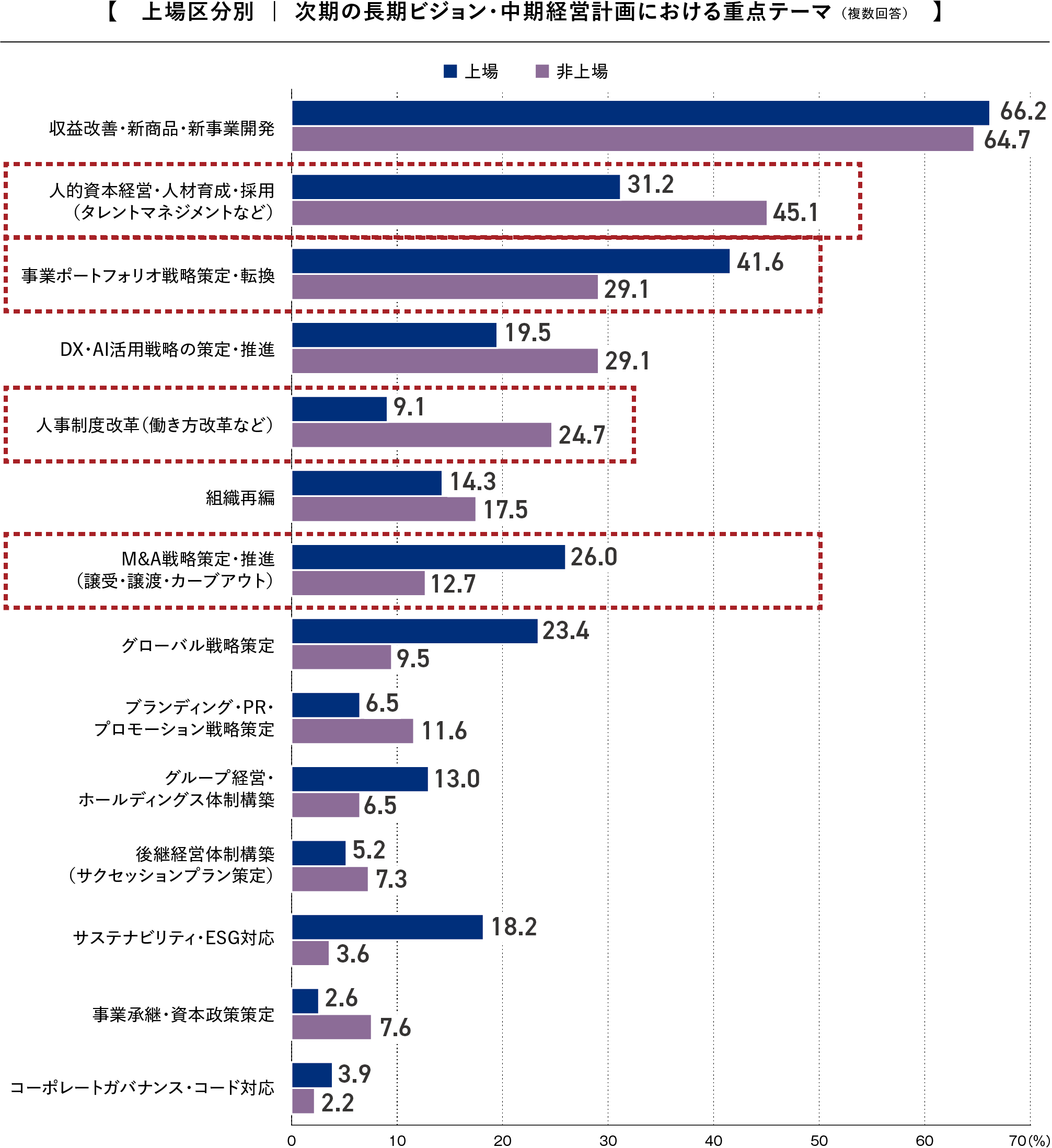 上場区分別では、上場企業が「事業ポートフォリオ戦略」(41.6%)や「M&A戦略」(26.0%)を重視する一方、非上場企業では「人的資本経営・人材育成・採用」(45.1%)や「人事制度改革(働き方改革など)」(24.7%)が上場企業と比較して高く、人材・制度面への関心の高さが際立っています。