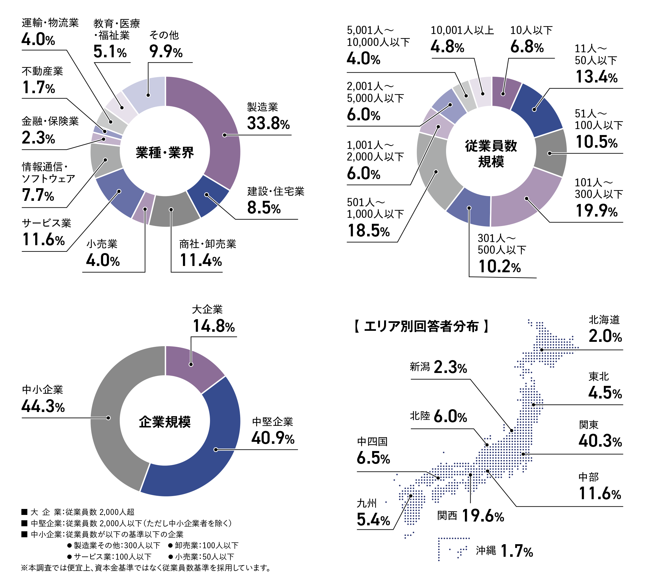 ※本調査では、資本金基準ではなく従業員数基準を採用しており、大企業:従業員数2,000人超、中堅企業:従業員数2,000人以下(ただし中小企業者を除く)、中小企業:製造業その他:従業員数300人以下、卸売業:従業員数100人以下、サービス業:従業員数100人以下、小売業:従業員数50人以下としております。