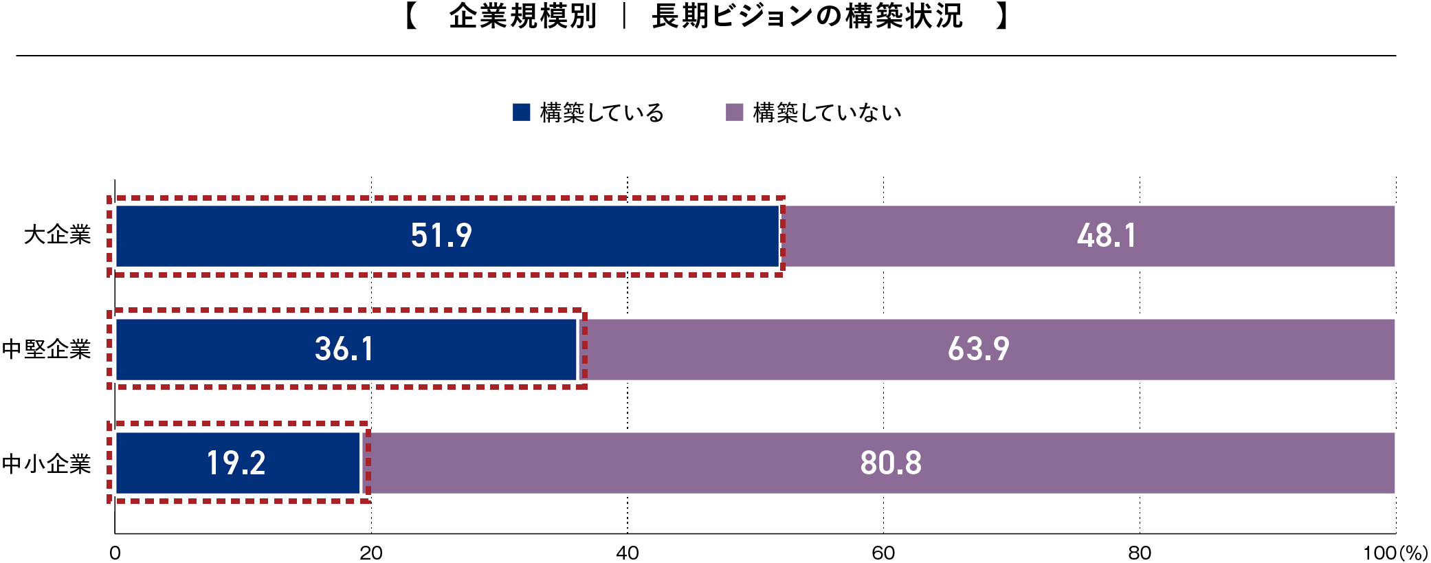 長期ビジョンを「構築している」と回答した企業では、大企業が51.9%、中堅企業が36.1%、中小企業が19.2%と、規模が小さくなるほど構築率が低下する傾向が顕著です。長期ビジョンとは、将来の自社のありたい姿やなりたい姿を構想して言語化したものであり、通常は10年以上先の未来を対象とします。環境変化が激しい中では、中期経営計画や単年度計画は柔軟に見直す必要がありますが、その変化に対応しながら中長期の戦略や投資をデザインするためには、長期ビジョンという不変の軸が求められます。