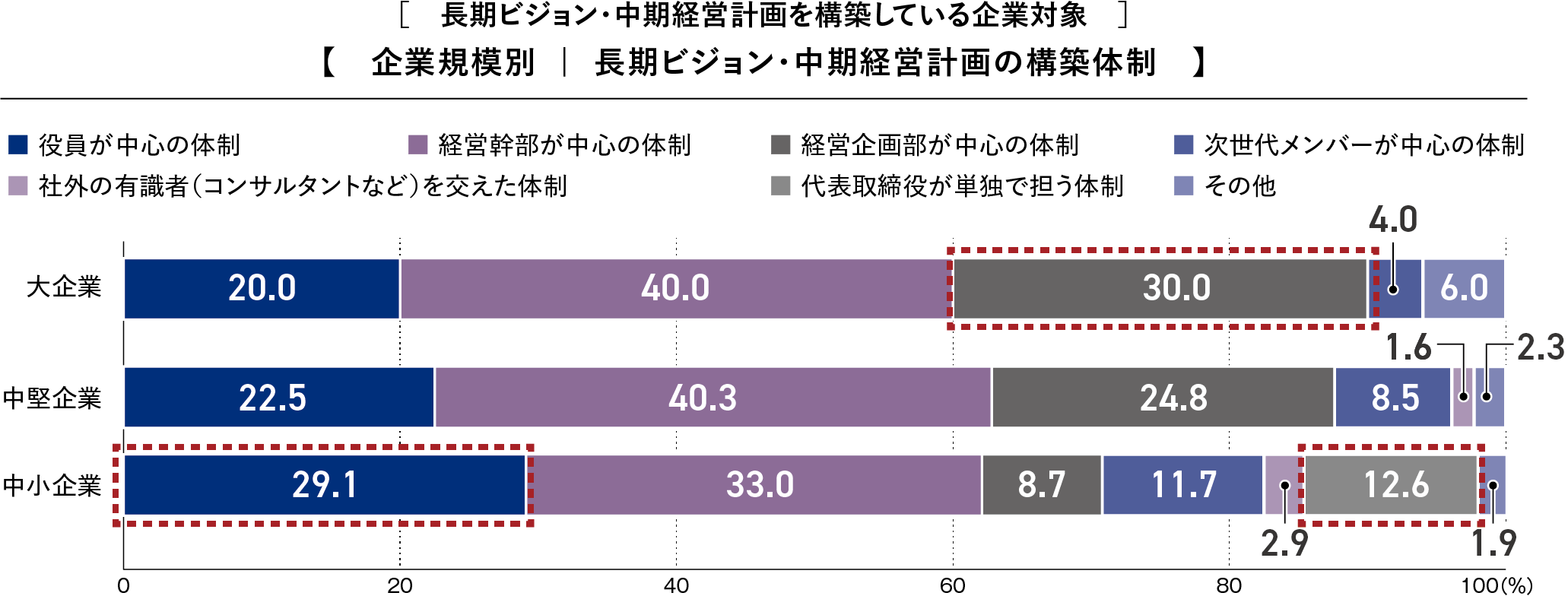 (2) 「長期ビジョン・中期経営計画の構築状況」の設問では、大企業は「経営企画部が中心」、中小企業は「経営幹部や役員が中心」「代表取締役が単独で担う」が多い結果となりました。