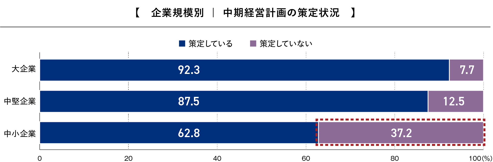 中期経営計画の策定状況では、大企業の92.3%、中堅企業の87.5%が「策定している」と回答した一方で、中小企業では62.8%にとどまり、4割近くが未策定という結果となりました。