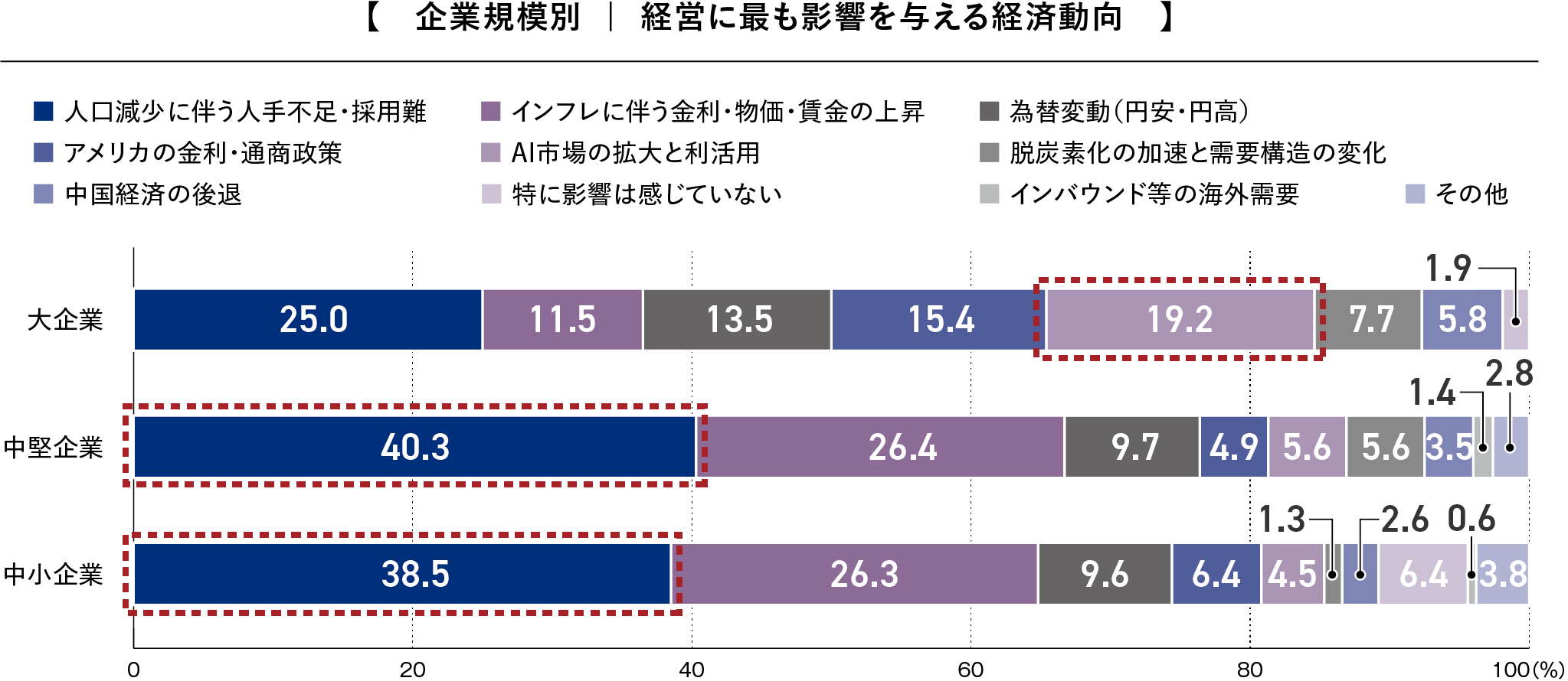 (1) 「経営に最も影響を与える経済動向」の設問では、中堅・中小企業は「人手不足」、大企業は「AI市場の拡大」が最多となりました。企業規模によって経営に対する影響要因が異なる実態が明らかになりました。