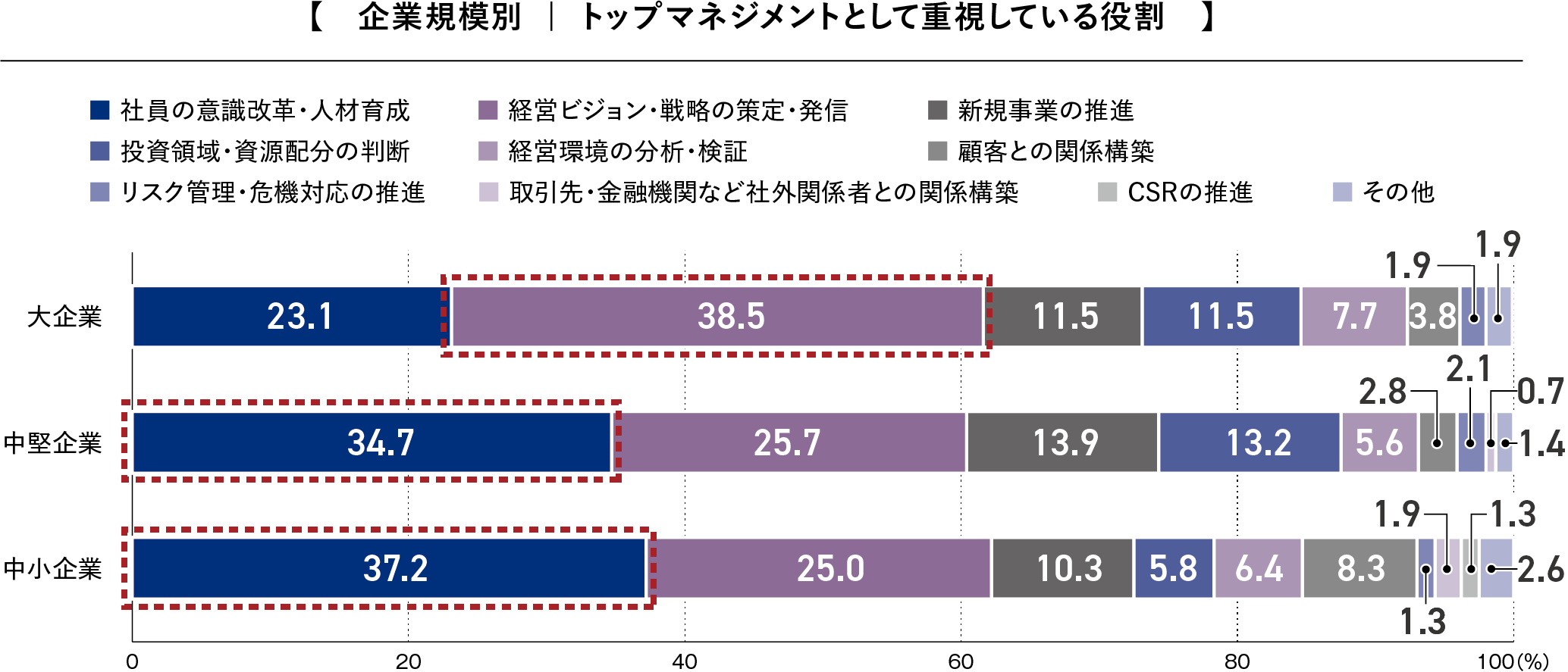トップマネジメント(経営層)として重視している役割についての設問では、中堅企業および中小企業では「社員の意識改革・人材育成」(中堅企業34.7%、中小企業37.2%)が最も多く挙げられました。特に中小企業では約4割が選択していることから、組織の内側からの変革が求められていることが示唆されます。一方、大企業では「経営ビジョン・戦略の策定・発信」(38.5%)が最も高く、環境変化への先導的な対応が重視されていることがうかがえます。