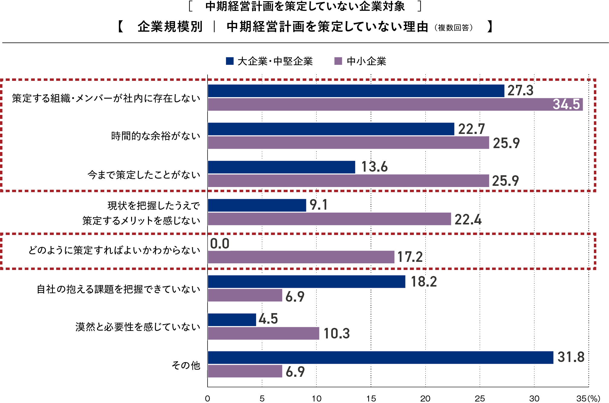 中期経営計画を策定していない企業を対象に理由を尋ねたところ、「策定する組織・メンバーが社内に存在しない」が最多となりました。中小企業では「今まで策定したことがない」(25.9%)が大企業・中堅企業より相対的に多く、「どのように策定すればよいかわからない」(17.2%)も目立つ結果となりました。中小企業では体制に加えて、経験・ノウハウの不足が重なっている様子がうかがえます。