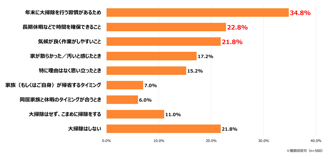 大掃除を行う時期の選び方について尋ねたところ、「年末に大掃除を行う習慣があるため」が34.8%で最も多い結果となりました。