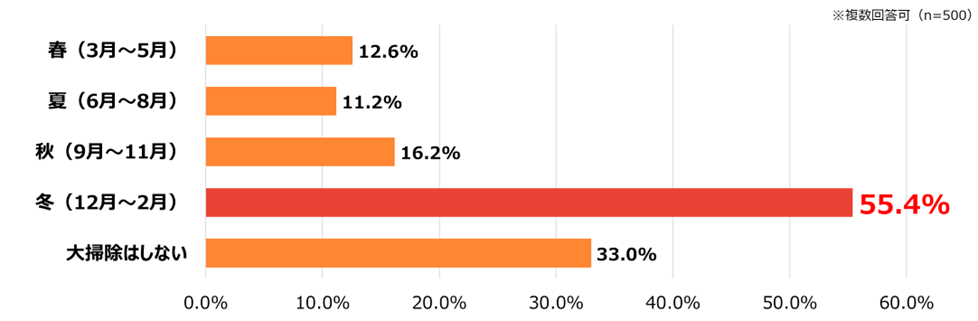 大掃除を行う時期について尋ねたところ、年末年始にあたる「冬(12月~2月)」と回答した人が55.4%で最も多く、半数を超える結果となりました。次いで「秋(9月~11月)」が16.2%、「春(3月~5月)」が12.6%、「夏(6月~8月)」が11.2%と続きました。一方で、「大掃除はしない」と回答した人も33.0%にのぼり、3人に1人は大掃除の習慣がないことがわかりました。
