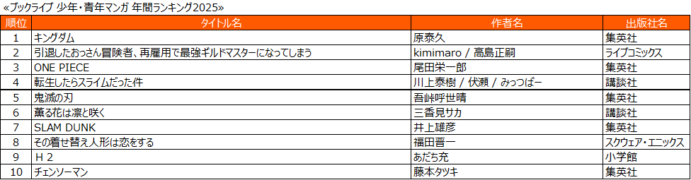 TOPPANホールディングス株式会社のグループ会社である、株式会社BookLive(本社:東京都港区・代表取締役社長:淡野 正)は、運営する総合電子書籍ストア「ブックライブ」にて、集計期間中の売上をもとにランキング化した「年間ランキング2025」を、本日11月28日(金)に発表しました。(集計期間:2025年1月1日~2025年11月6日)
