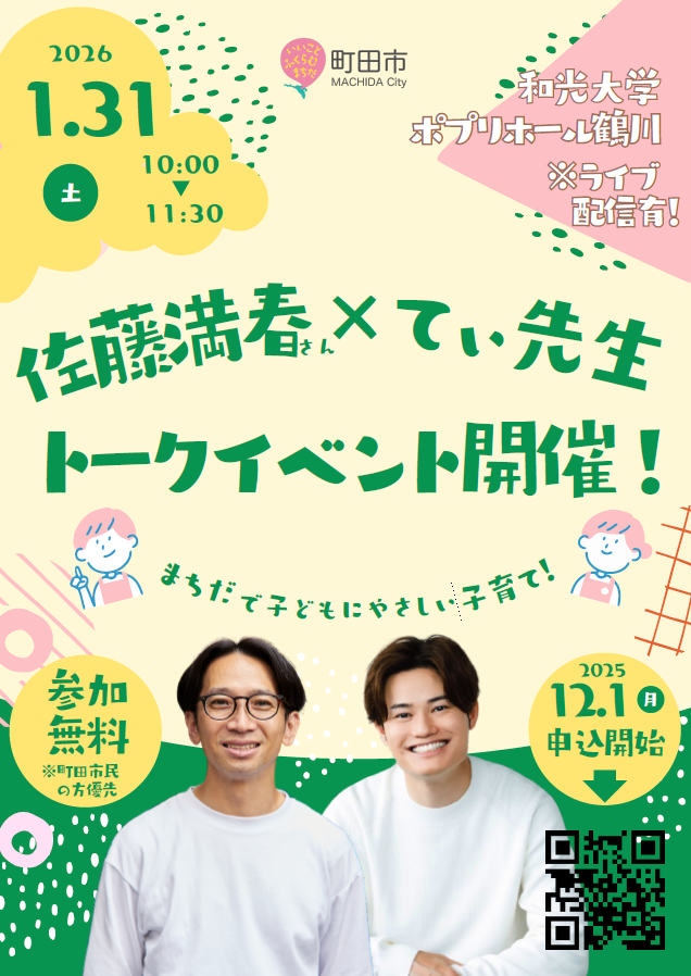 昨年度開催し、参加者アンケートの回答で「子育てに役立つ内容だった」が100%(※)であった「佐藤満春さん×てぃ先生 トークイベント~まちだで子どもにやさしい子育て!~」を1月31日に開催します。