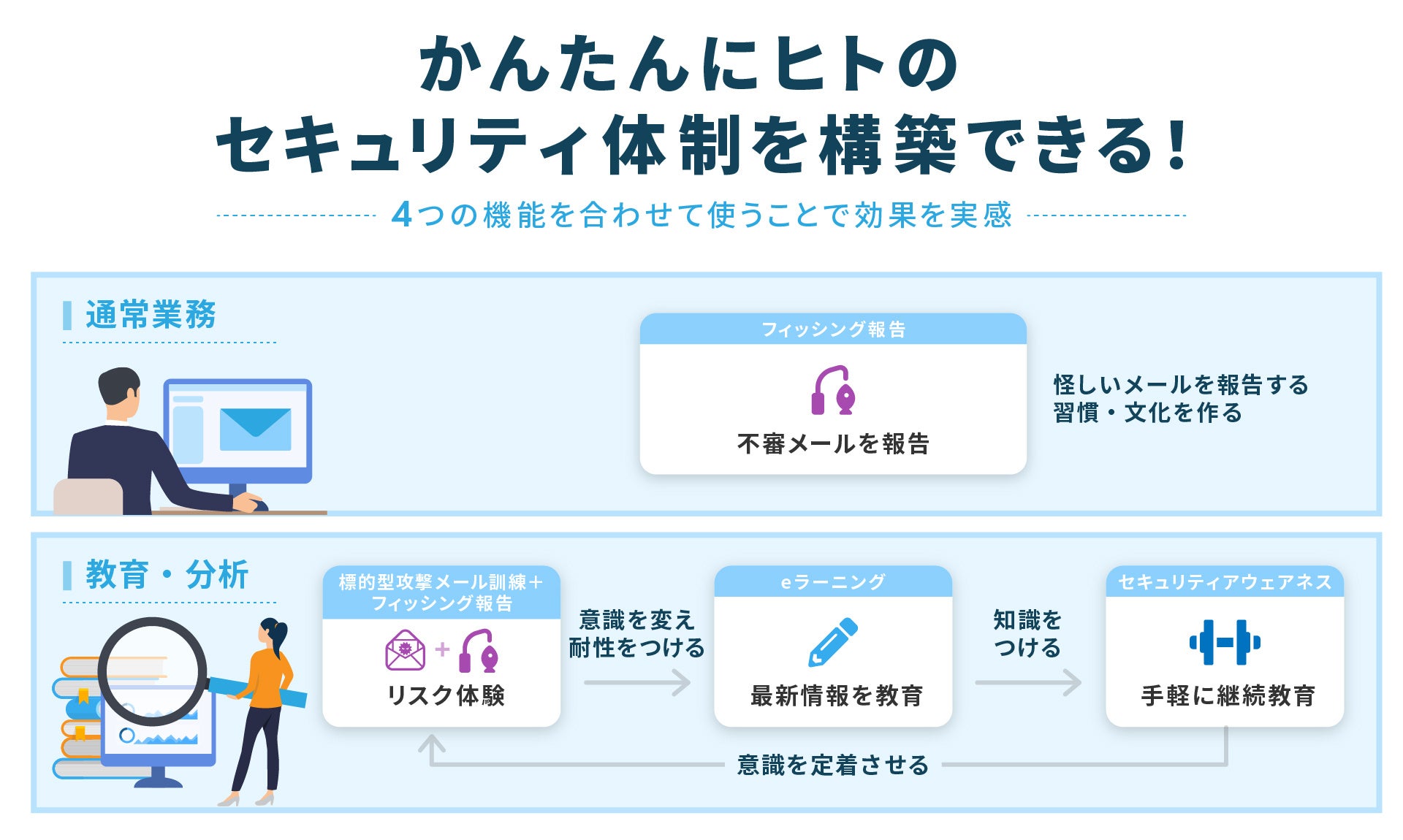 学習コンテンツに加えて日常的な行動習慣にアプローチできるようなセキュリティ教育に特化した機能など、お悩みに合わせてカスタマイズしながらご利用いただくことが可能です。