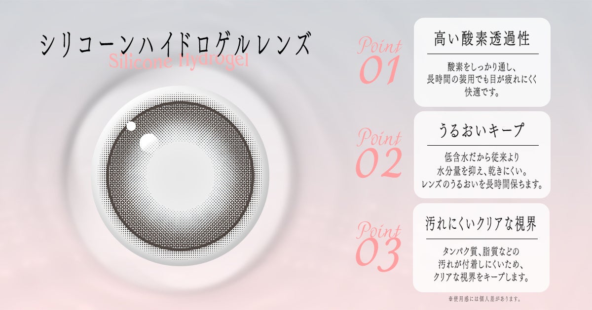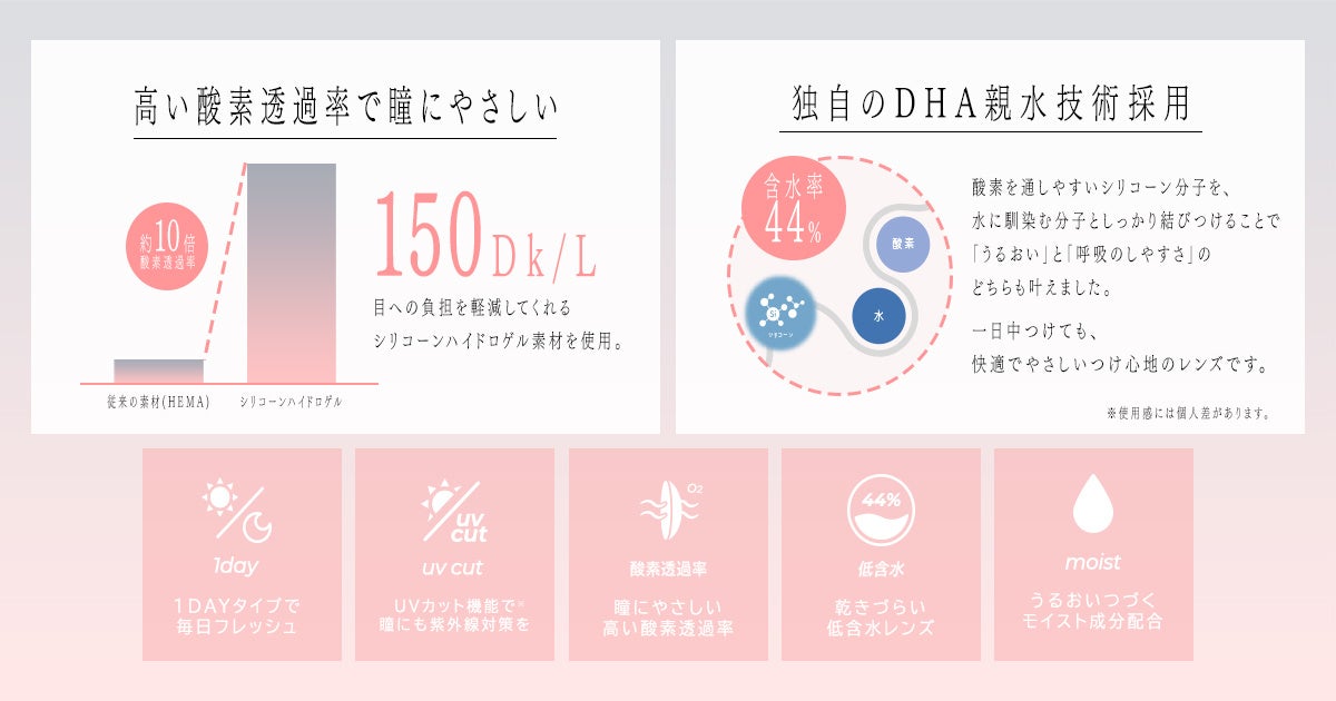 瞳の負担を軽減してくれるシリコーンハイドロゲル素材を採用し、高い酸素透過性と含水率44%の快適さを実現。心地よい装用感と、清潔感のあるクリアな見え方をサポートいたします。