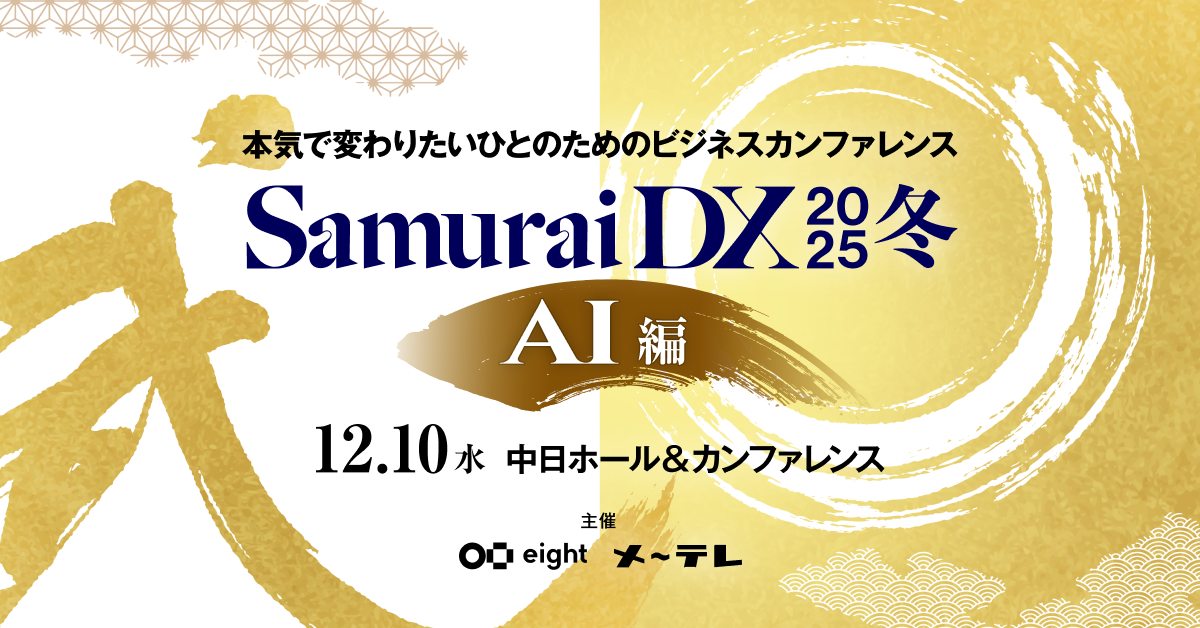 「SamuraiDX 2025 冬」は、名刺アプリEightとメ~テレが主催するDXカンファレンスで、2025年12月10日(水)~12月12日(金)に開催されます。今年は「戦国や幕末の英雄たちが実践したイノベーションを経営に生かす」をテーマとし、各界の先駆者による対談や、DX・AIの最前線を担う企業による導入事例が披露されます。実務に直結する具体的なノウハウが得られることから、多くのビジネスパーソンが参加する人気イベントです。