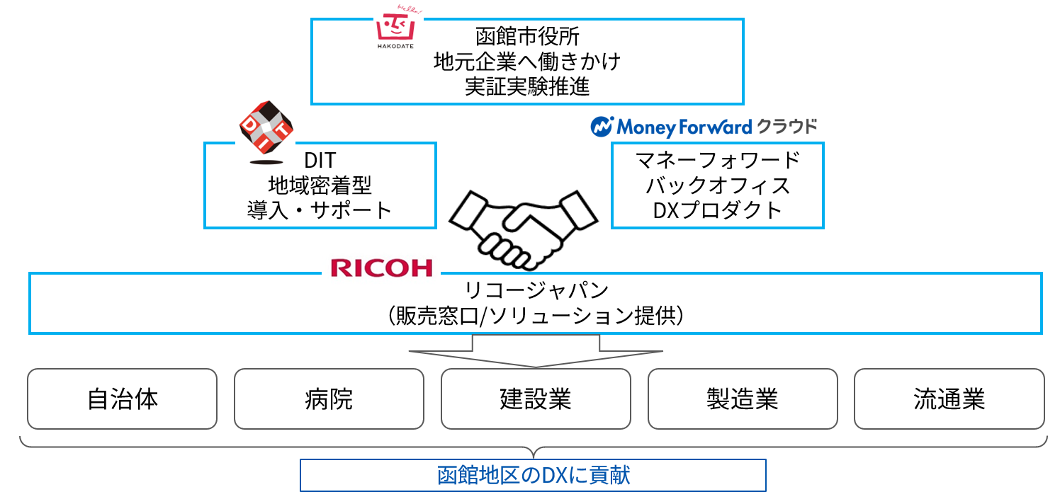 リコージャパン北海道支社、DIT、マネーフォワードの三社が連携・協力のもと、函館(道南地区)の自治体および企業のDXを推進し、地域社会の持続的な発展に寄与することを目的とします。