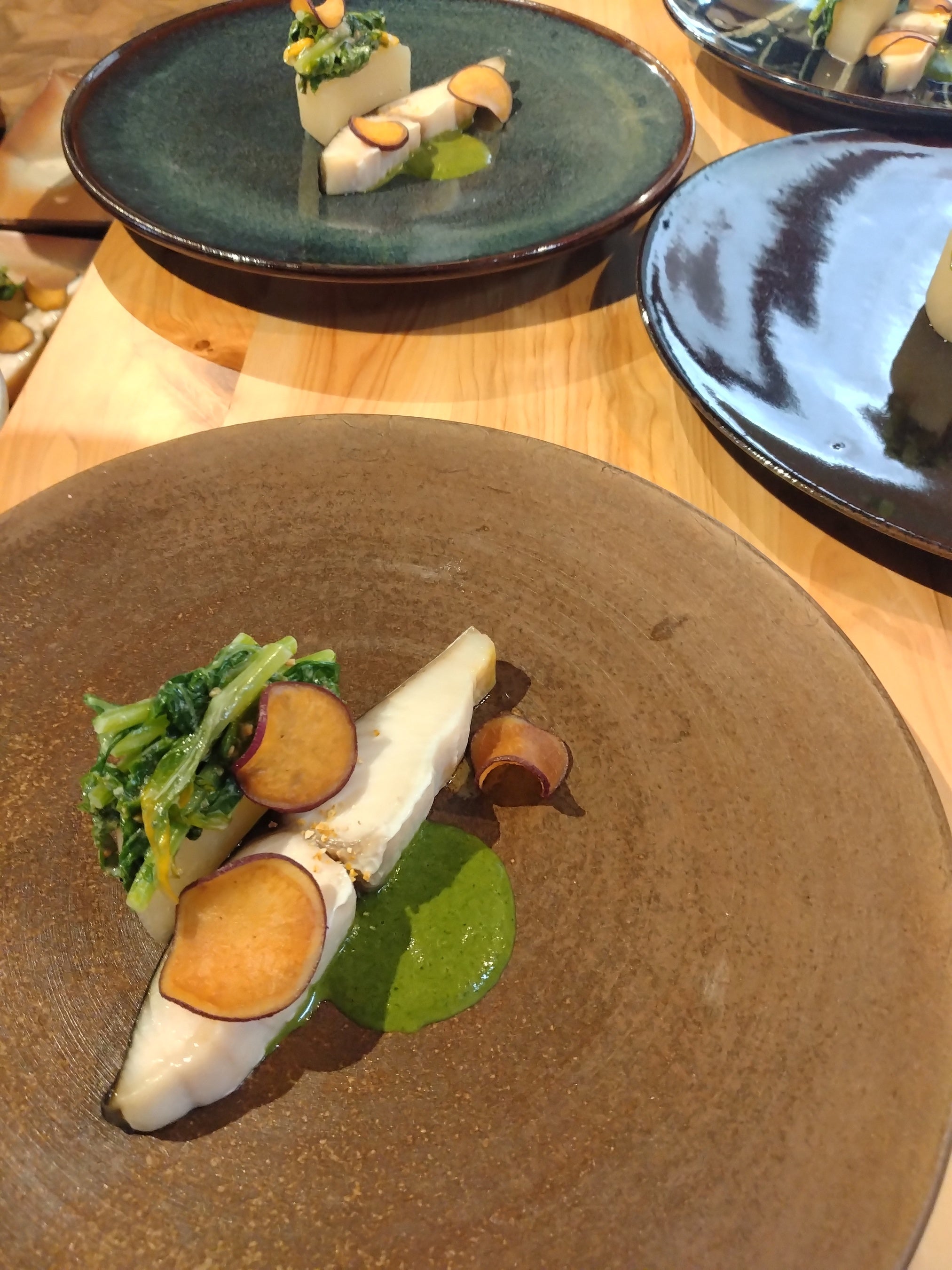 石灰石をのせる器には美濃焼の豆皿を採用しました。平尾台の草原をイメージしたグリーンと太古の海をイメージしたグレーの2色を今回のプロジェクトのために特別に焼いていただいています。