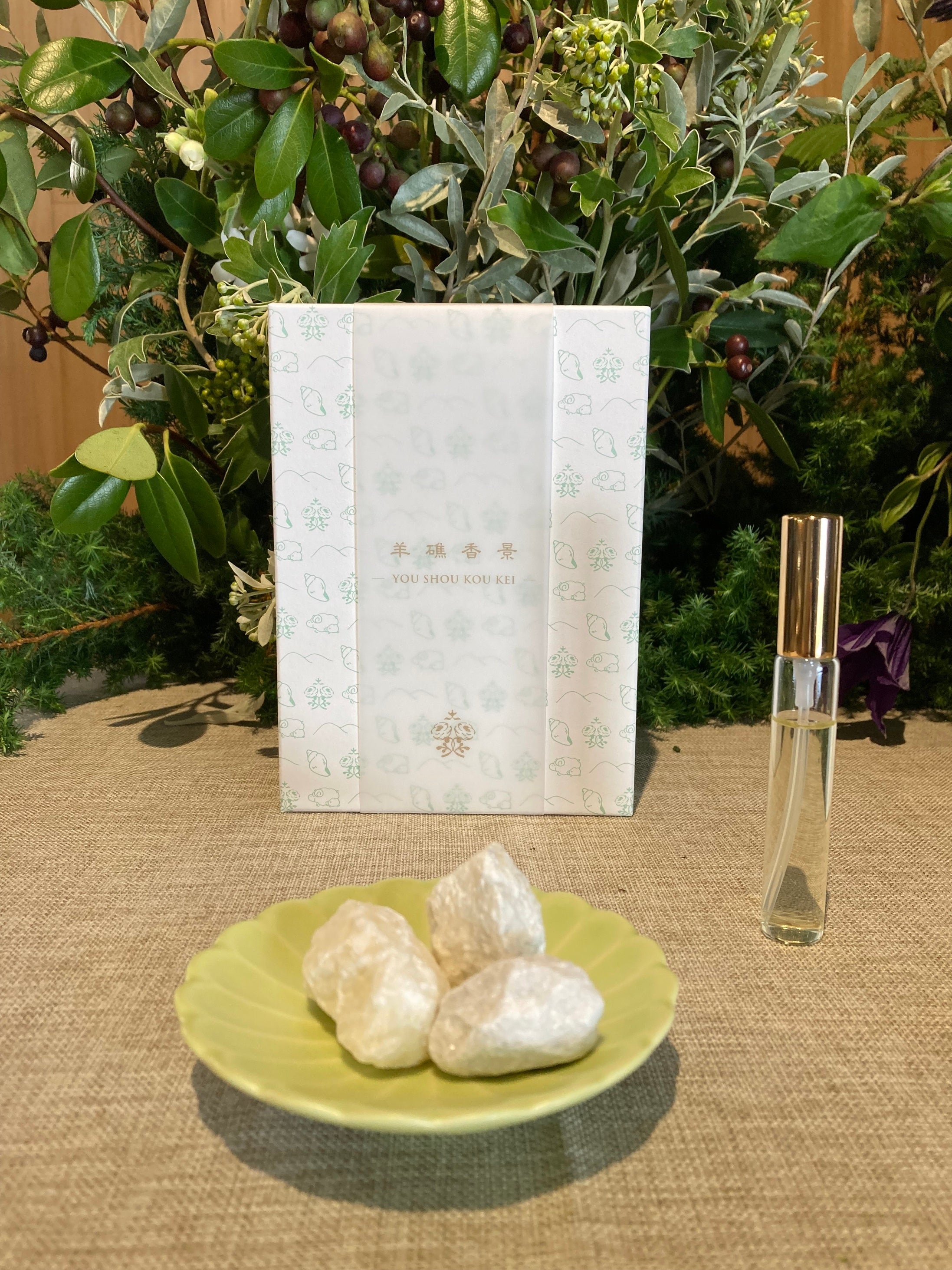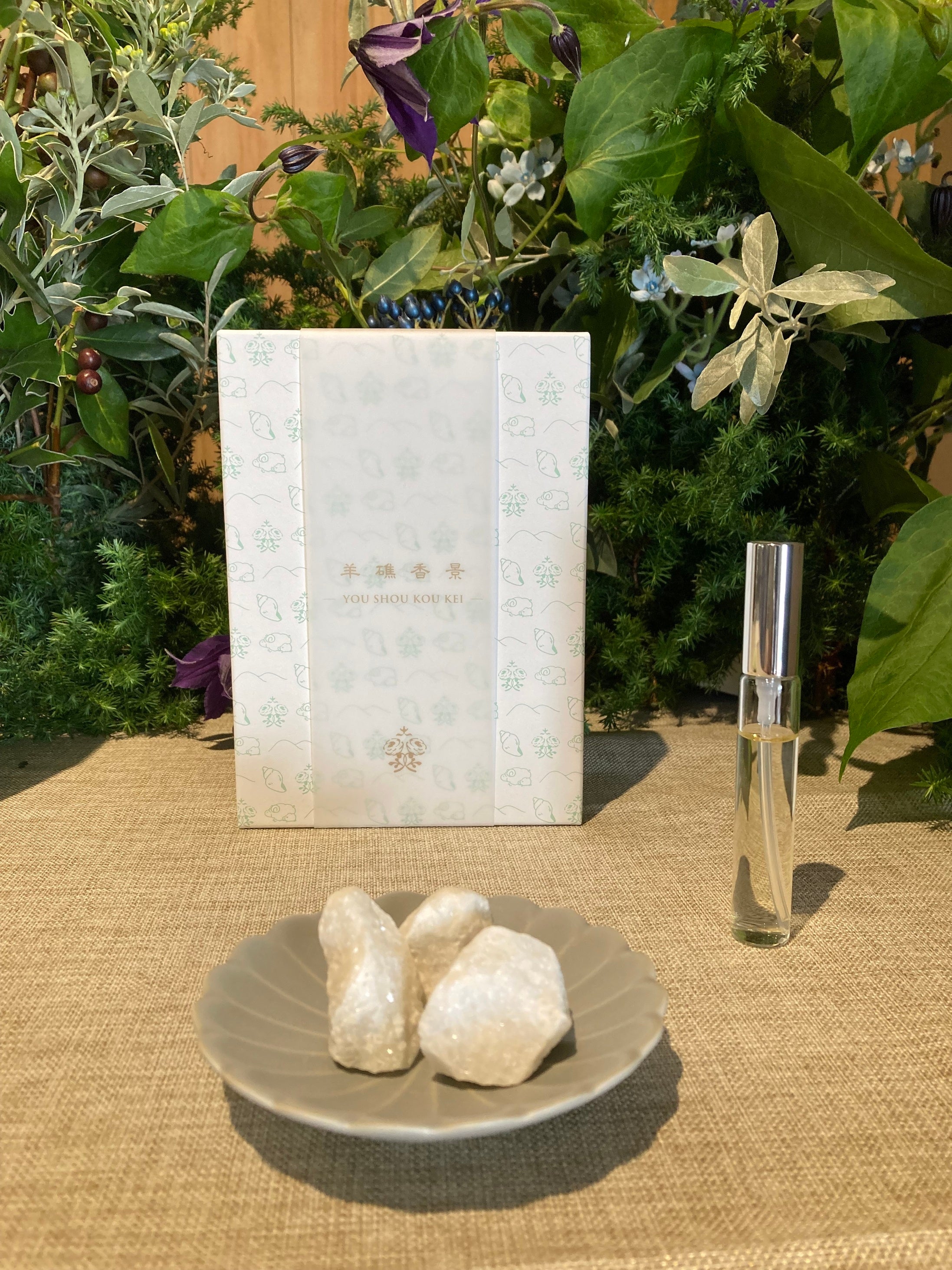 豆皿に石灰石をのせてルームフレグランスを吹きかけると、香る「小さな平尾台」として卓上でお楽しみいただけます。