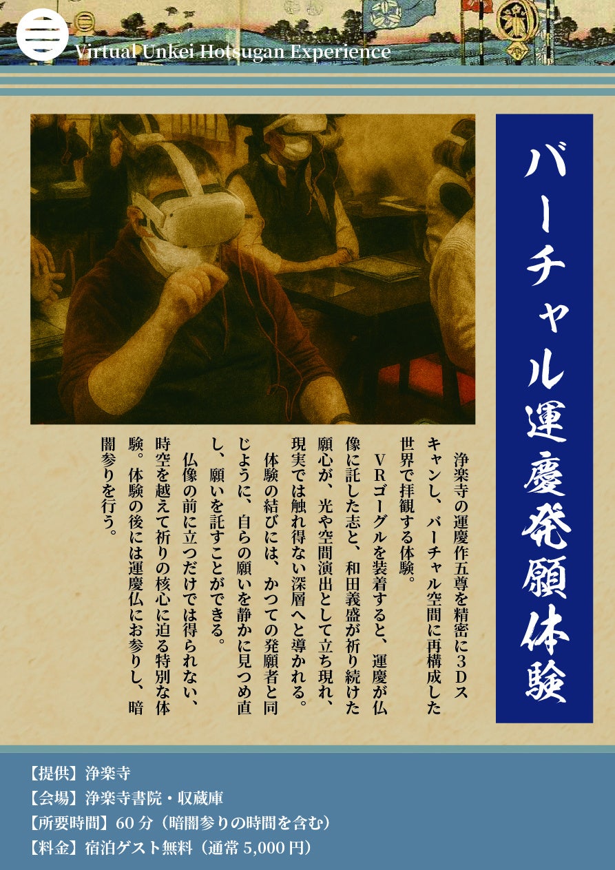 浄楽寺の運慶作五尊を精密に3Dスキャンし、バーチャル空間に再構成した世界で拝観していただく体験です。VRゴーグルを装着すると、運慶が仏像に託した志や、和田義盛が祈り続けた願心が、光や空間演出として立ち現れ、現実では触れることのできない深層へと導かれていきます。体験の結びには、かつての発願者と同じように、自らの願いを静かに見つめ直し、その願いを託す時間をお過ごしいただけます。仏像の前に立つだけでは得られない、時空を越えて祈りの核心に迫る特別な体験となります。体験の後には、運慶仏にお参りし、暗闇参りも行っていただきます。