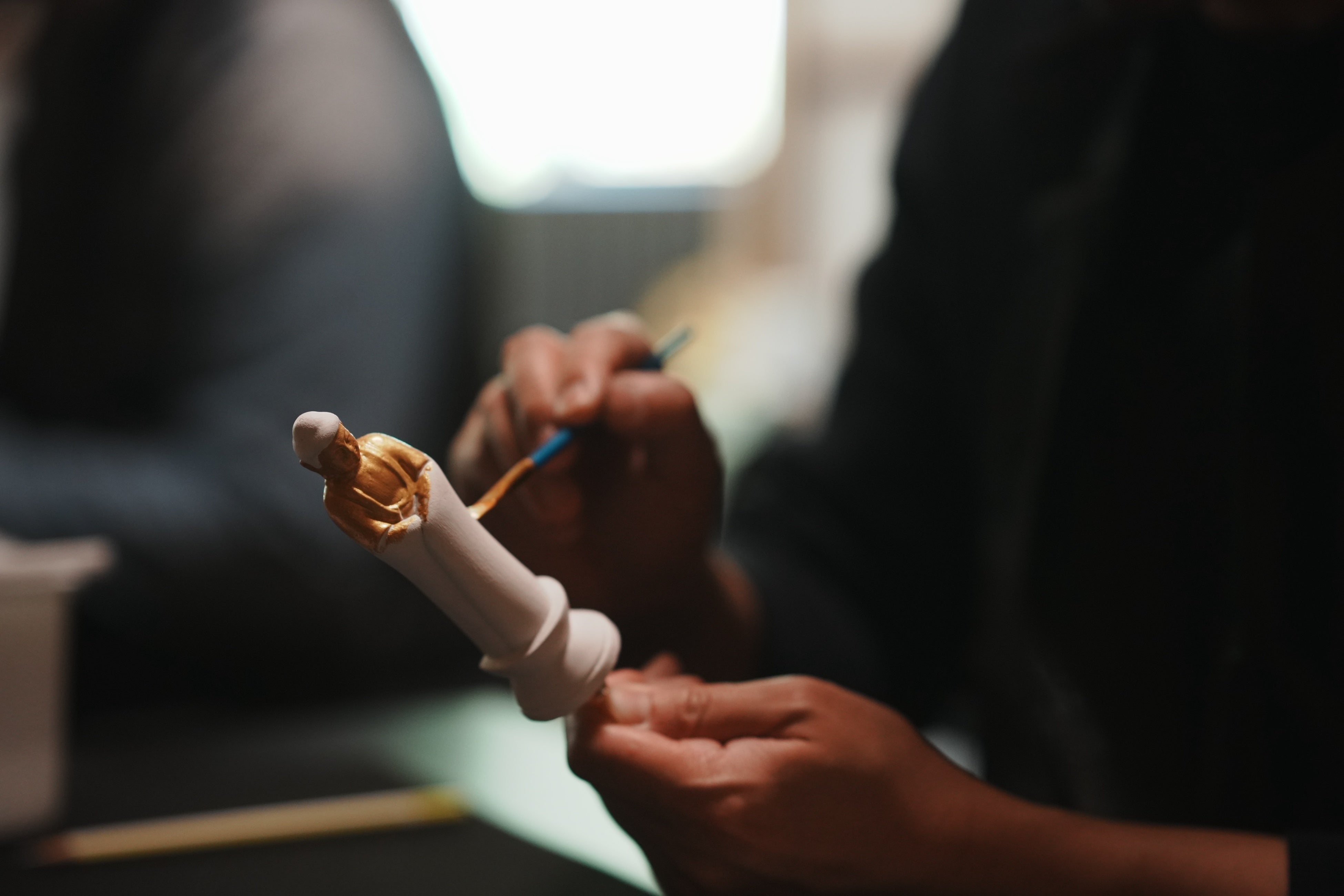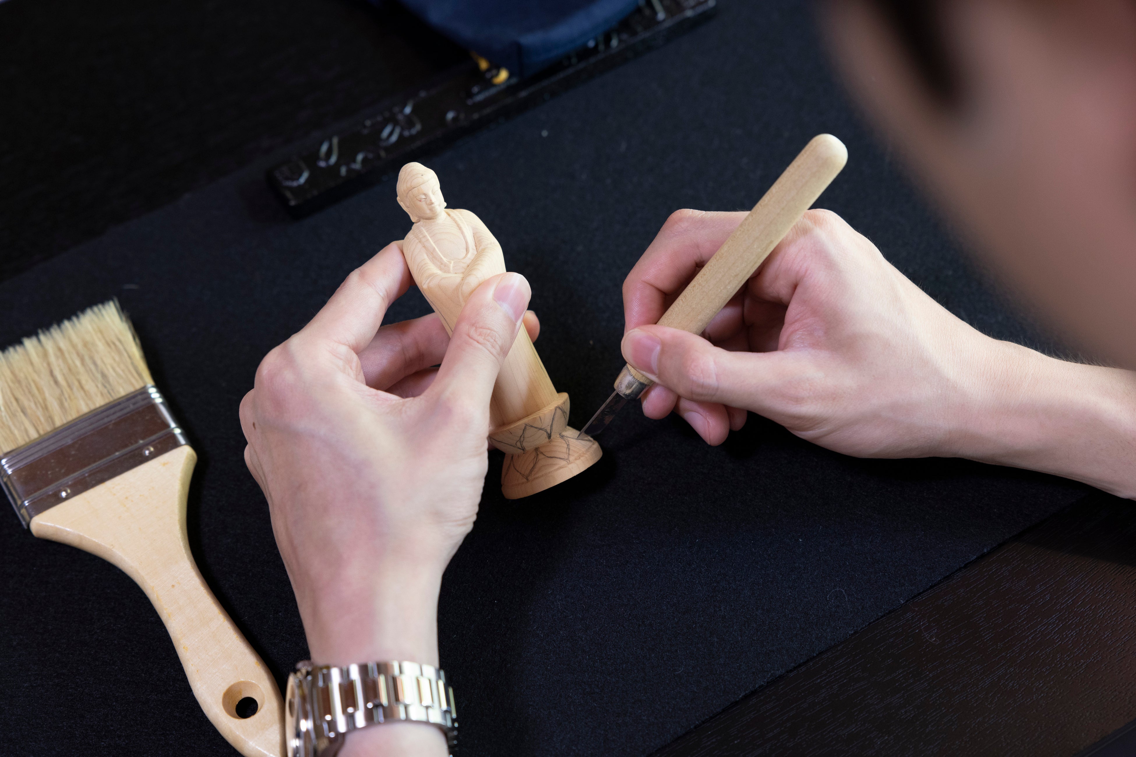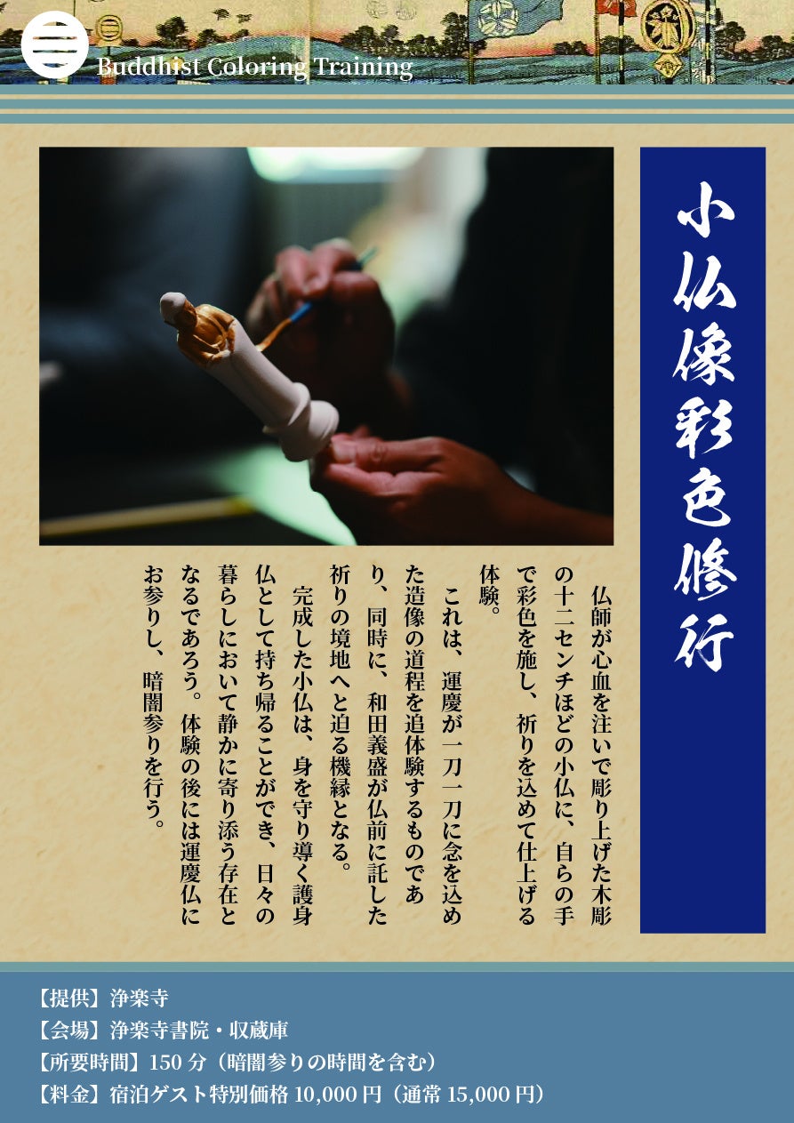 仏師が心血を注いで彫り上げた木彫の小仏(約12センチ)に、自らの手で彩色を施し、祈りを込めて仕上げていただく体験です。これは、運慶が一刀一刀に念を込めて歩んだ造像の道程を追体験するものであり、同時に、和田義盛が仏前に託した祈りの境地へと迫る機縁ともなります。完成した小仏は、身を守り導く護身仏としてお持ち帰りいただけますので、日々の暮らしに静かに寄り添う存在となることでしょう。体験の後には、運慶仏にお参りし、暗闇参りも行っていただきます。