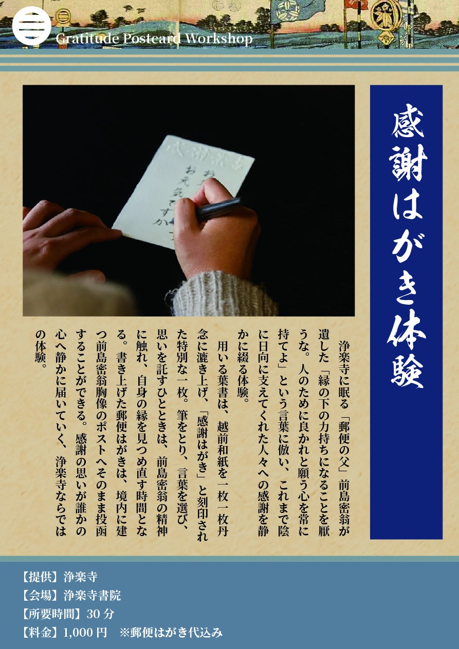浄楽寺に眠る「郵便の父」前島密翁が遺した「縁の下の力持ちになることを厭うな。人のために良かれと願う心を常に持てよ」という言葉にならい、これまで陰に日向に支えてくれた人々への感謝を静かに綴っていただく体験です。用いる葉書は、越前和紙を一枚一枚丹念に漉き上げ、「感謝はがき」と刻印された特別な一枚です。筆をとり、言葉を選び、思いを託すひとときは、前島密翁の精神に触れ、自らの縁をあらためて見つめ直す時間となります。書き上げた郵便はがきは、境内に建つ前島密胸像のポストへそのまま投函していただけます。感謝の思いが、誰かの心へ静かに届いていく浄楽寺ならではの体験です。