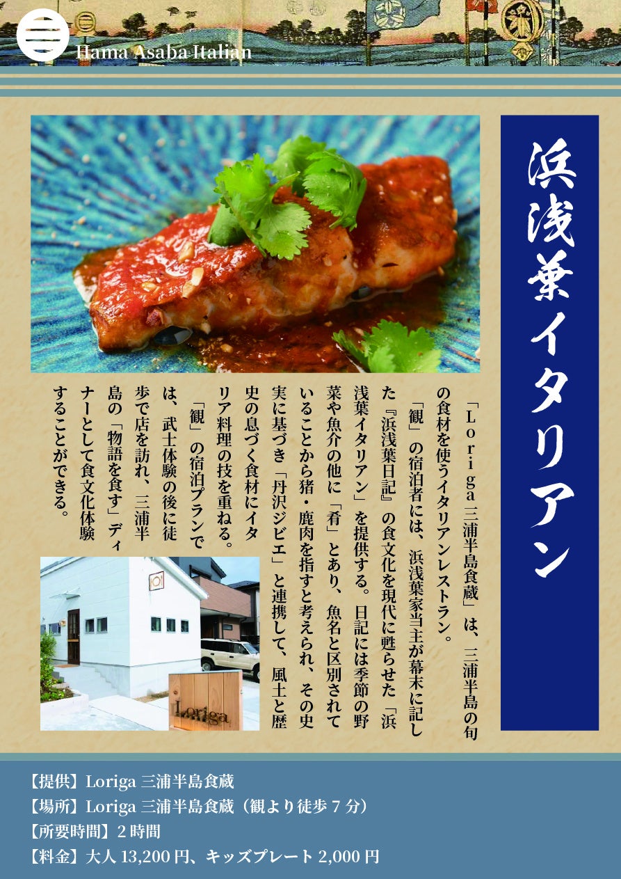 本プランでは、「観」へご宿泊いただき「写経修行」、「バーチャル運慶発願体験」、「運慶仏の暗闇参り」など、武士文化に触れる体験を行っていただけます。体験後の夕食には、幕末~明治期の豪農・浜浅葉家が三代約70年にわたり記録した『浜浅葉日記』に残る食文化を現代的に再解釈し、三浦半島の魚介・野菜・ジビエを使って構成した「浜浅葉イタリアン(ジビエ)」(8品フルコース)を、近隣のイタリアンレストラン「Loriga三浦半島食蔵」(徒歩7分)にてお楽しみいただけます。本プランは、「観」の宿泊(素泊まり)に対し、Loriga三浦半島食蔵のディナー予約代行をセットした特別オプションプランです。