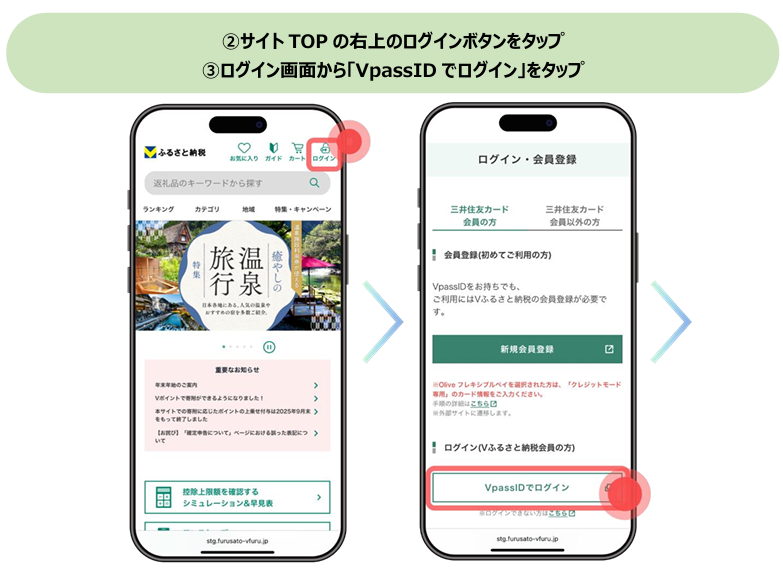 「Vふるさと納税」は、SMBCグループが提供する個人のお客さま向け総合金融サービス「Olive(オリーブ)」における非金融サービスの新たな事業として、2025年7月3日よりサービスを開始したふるさと納税ポータルサイトです。自治体数約1,600、返礼品数約70万という豊富なラインナップを誇り、「Vpass」からシームレスにアクセス・ログインしご利用いただけることが特徴です。■ご利用方法