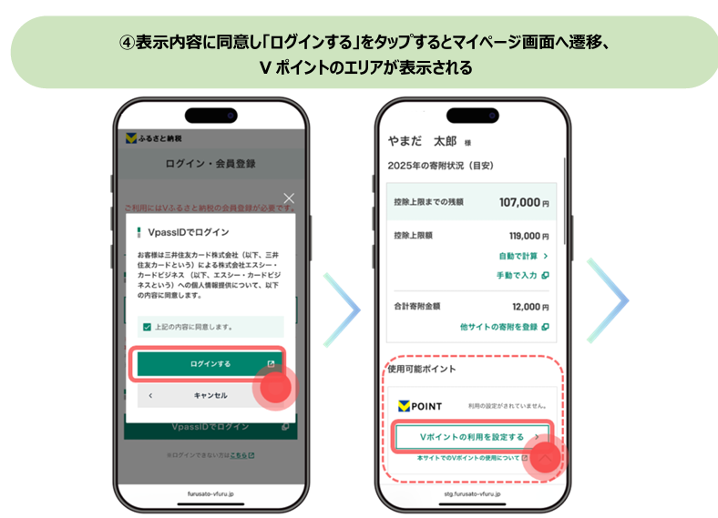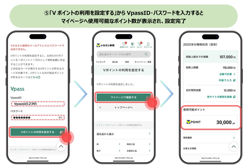 Vポイントを寄附金額へ充当してご利用いただくためには、初回設定が必要です。「Vふるさと納税」にVpassIDでログインの上、Vポイントの利用を設定していただくことで、1ポイント=1円分としてご利用いただけるようになります。<初回設定>