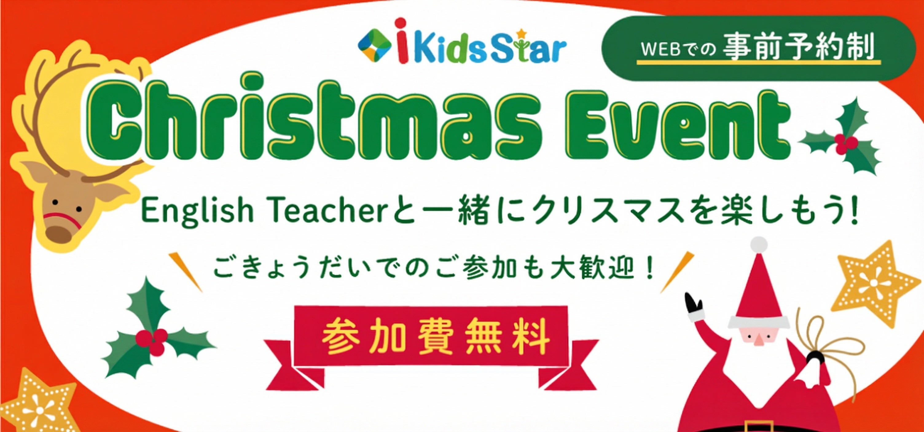 クリスマスイベントでは、実際にi Kids Starのクラスを担当しているEnglish Teacherと一緒に簡単なゲームやパネルシアターなどの楽しいアクティビティを体験できます。もしかすると、サンタさんがやってくる園も・・・!i Kids Starに入園されていないごきょうだいやお友だちも、もちろん大歓迎です。園の雰囲気を実際に知りたい方や、来年度以降の入園を検討されている方も、ぜひお気軽にご参加ください。