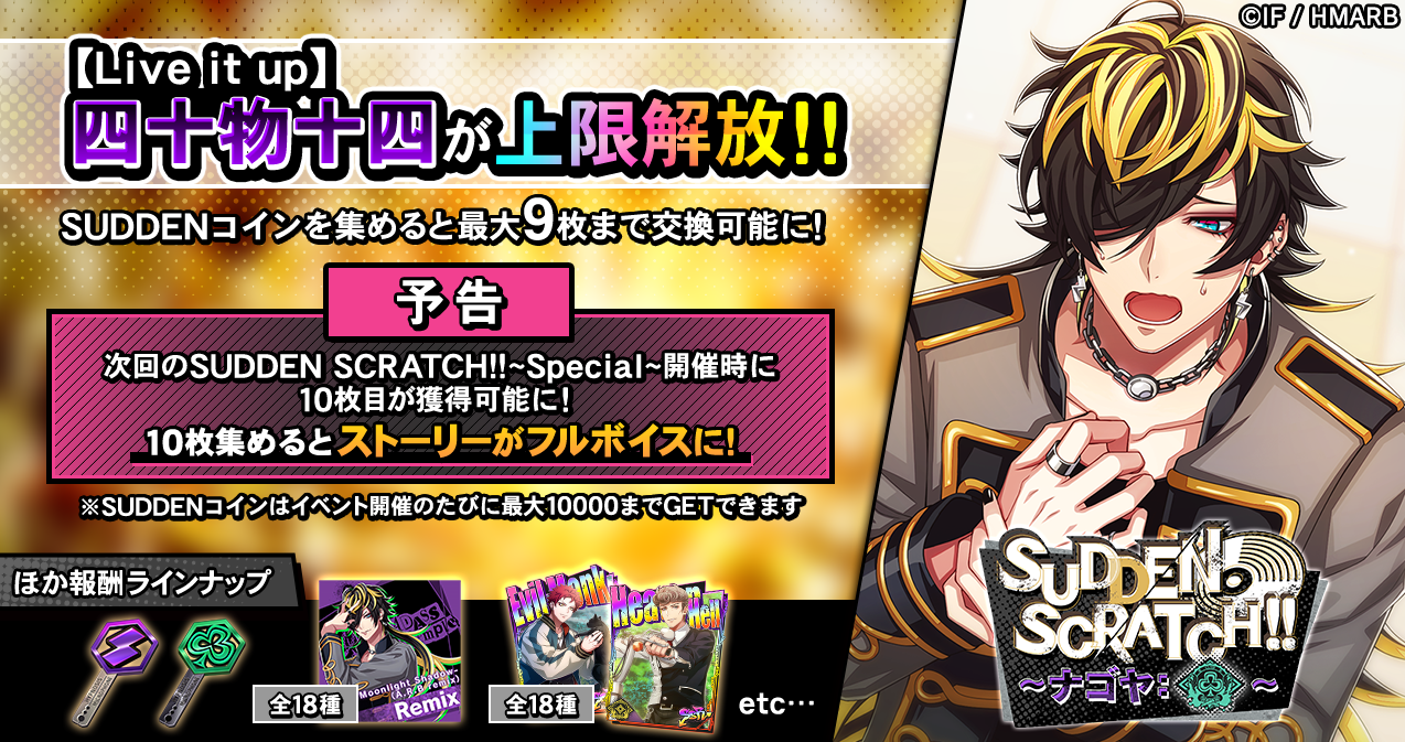 イベント期間中、KILLER SCRATCH!!をプレイするとライズ消費量に応じた確率でSUDDEN SCRATCH!!が発生します。SUDDEN SCRATCH!!をプレイすると、通常の報酬アイテムの他、限定アイテム「SUDDENコイン」を獲得することができます。「SUDDENコイン」を集めることで、「A.R.B remix」楽曲やレイズキー、ナゴヤ・ディビジョンのデコステッカーに使えるブースターなどと交換することが可能です。また、ストーリーカード「SSR【Live it up】四十物十四」が上限解放され、最大9枚まで獲得できます。さらに、SUDDEN SCRATCH!!~Special~の開催時には10枚目が獲得可能となり、10枚集めるとカードストーリーがフルボイスに!詳細はアプリ内お知らせをご確認ください。