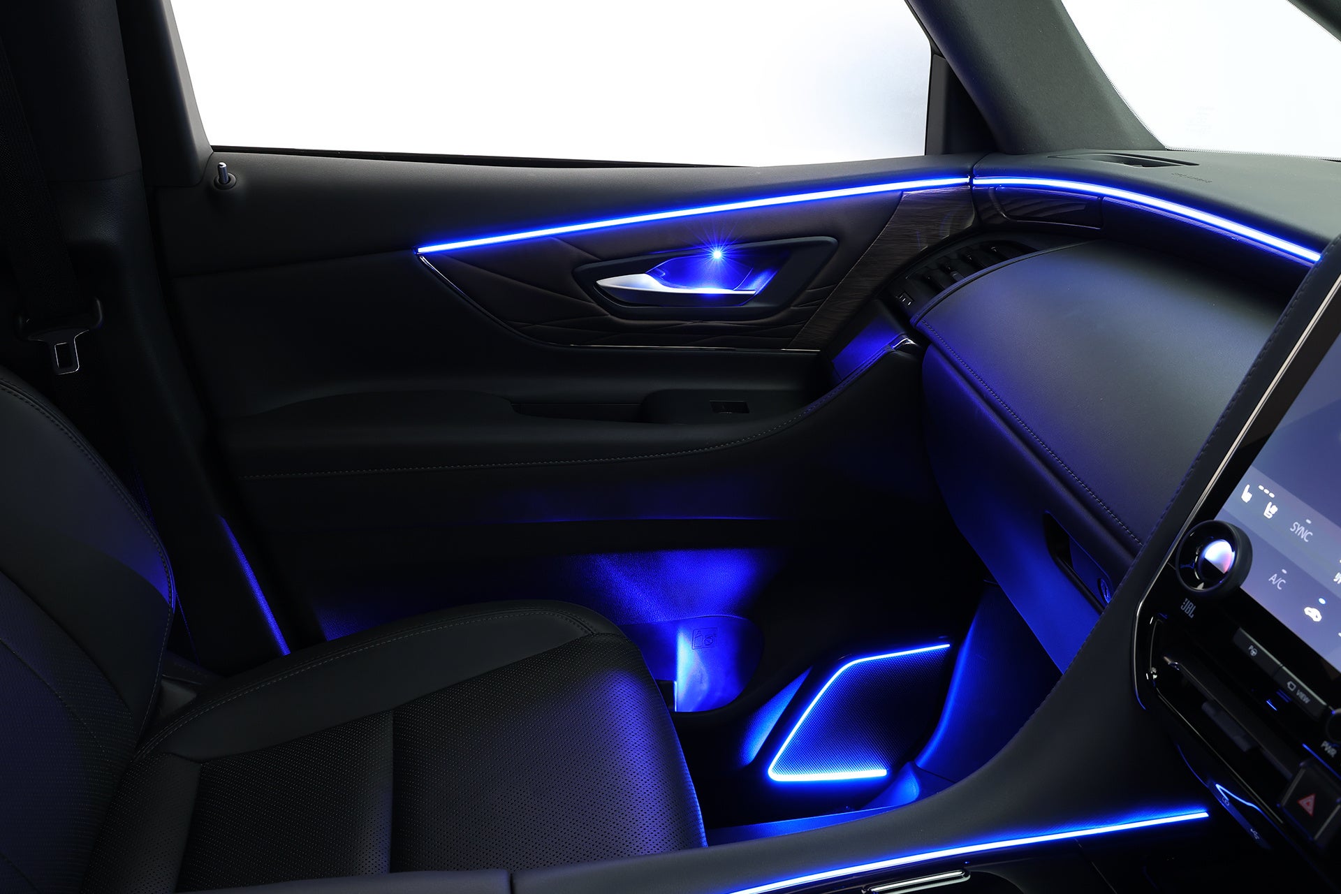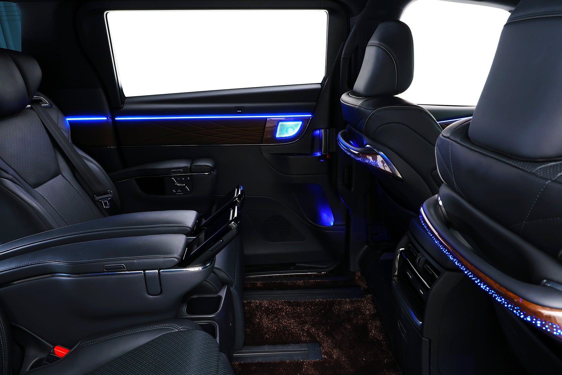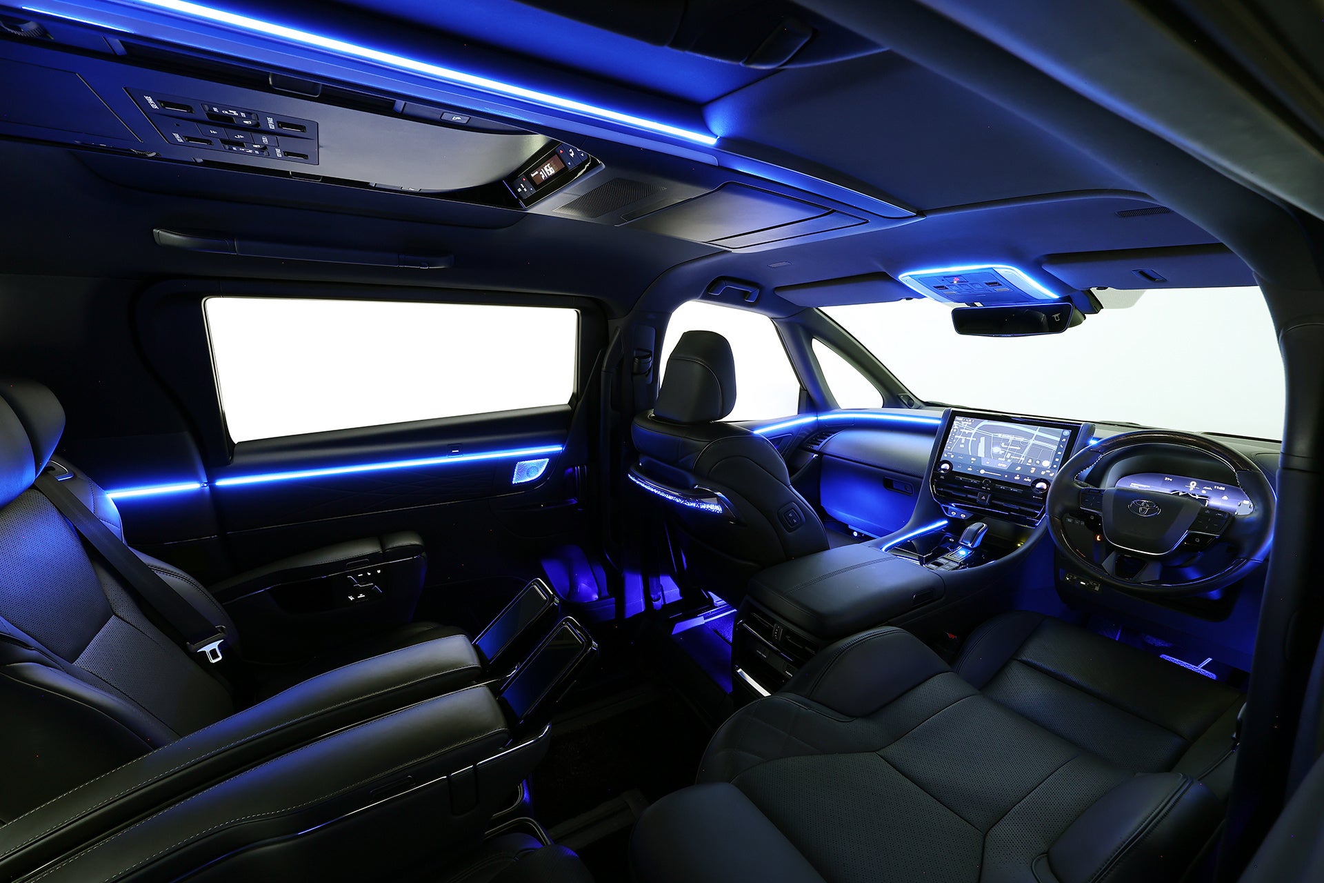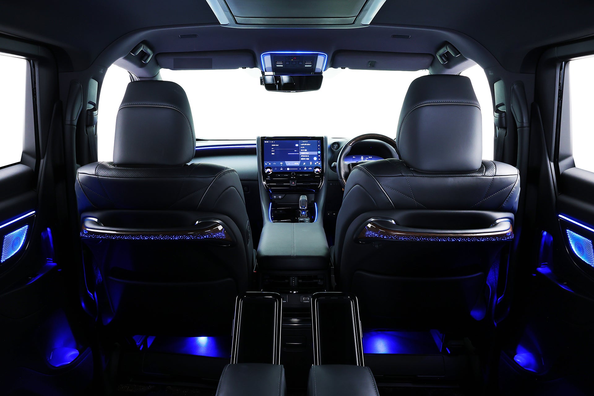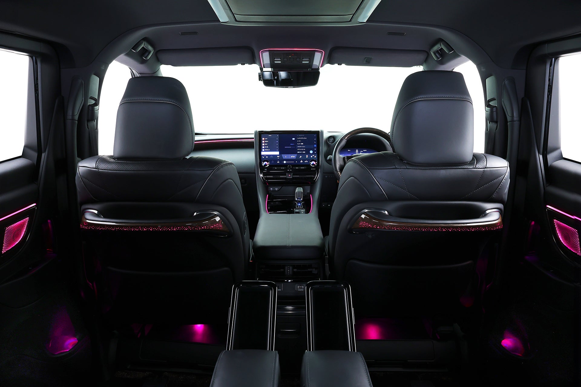 40アルファード・ヴェルファイア用アンビエントライトは、インパネフロントラインやフロントドアデコラインはもちろん、ドームランプ周囲、シフトレバー周囲、フロントドアノブ間接照明、フロントドアドリンクホルダー間接照明といったさりげないポイントもカバー。さらにフロントドアスピーカーデコラインまでライティング。リアは、スライドドアパネルデコライン、スライドドアドリンクホルダー、スライドドアノブ間接照明、スライドドアスピーカーグリル、Cピラーデコライン、運転席と助手席背面のハンドル部にも設定。さらに運転席と助手席の足元、運転席と助手席下から後席の足元を照らす間接照明も用意。アルファード・ヴェルファイアらしく、リアシートへのおもてなしも万全です。オーナーの所有欲を刺激し、乗るたびに満足感を感じて頂ける光の演出が魅力です。