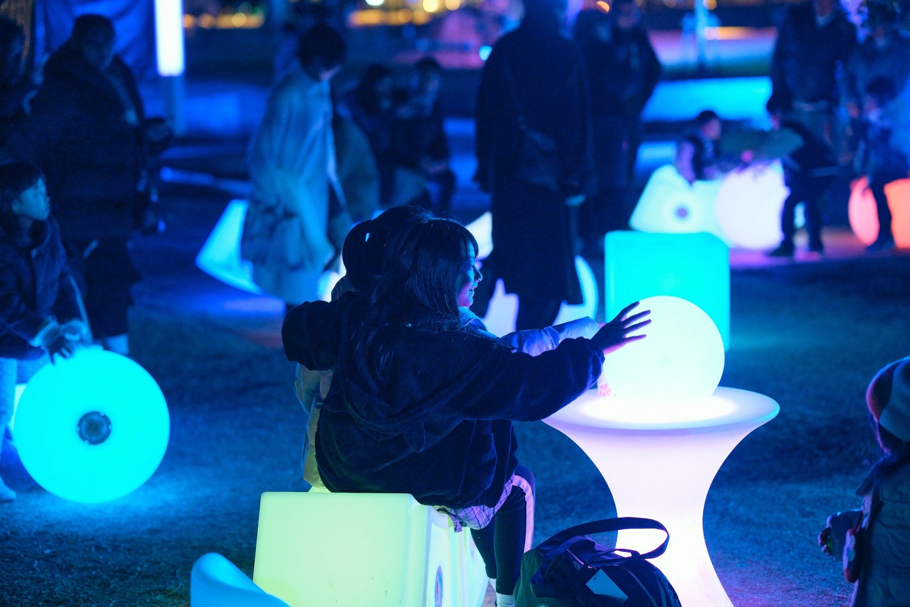 芝生エリアから先にはライティングファニチャーと海の光をイメージしたクリスマスツリー(高さ7m)が光り輝きます。お食事やドローンショーを楽しみながらイルミネーションの中でおくつろぎいただけます。