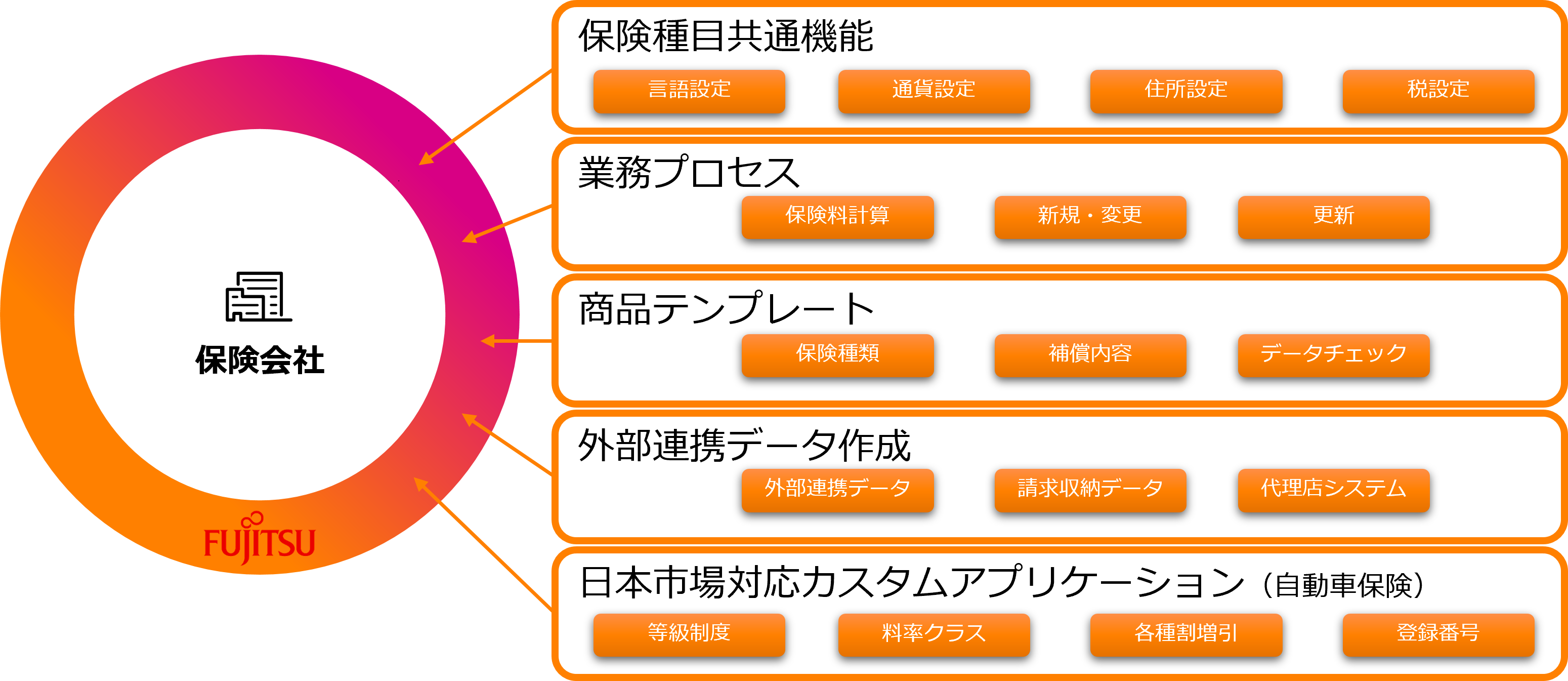そこで当社は、上記の課題を解決するため、保険業界の基幹業務を網羅したSAP Fioneerの「SAP Fioneer Cloud for Insurance」をベースに、日本市場特有の業務プロセスや法規制などに対応した機能やテンプレート、外部とのデータ連携機能などを独自開発し拡充した「Fujitsu Cloud for Insurance Japan Edition」を開発しました。第一弾として、保険種目に関わらず使用する言語設定などの共通機能・業務プロセスや、代理店型保険およびネット型保険のいずれにもニーズの高い自動車保険向けの機能を中心としたプラットフォームの提供を開始します。