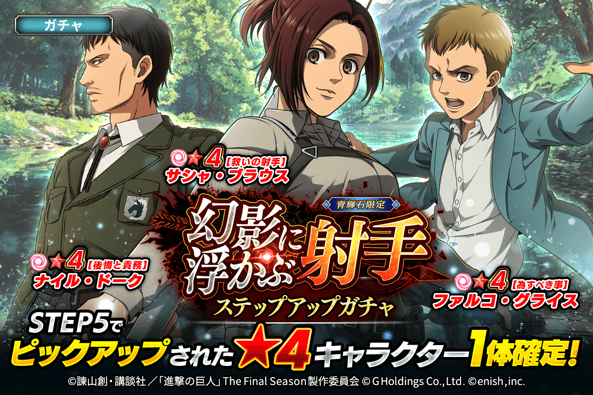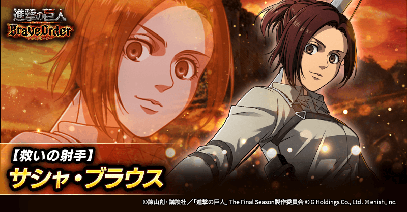株式会社enish(本社:東京都港区、代表取締役社長:安徳 孝平、以下enish)は、アニメ『進撃の巨人』のスマートフォンゲーム最新作「進撃の巨人Brave Order」にて、2025年11月28日(金)より、新イベントの幻影に浮かぶ射手を開催!また、本日より【救いの射手】サシャ・ブラウス、【為すべき事】ファルコ・グライス、【後悔と責務】ナイル・ドークが登場する「幻影に浮かぶ射手ガチャ」も開催!その他、最新情報はゲーム公式サイト・ゲーム公式X(旧Twitter)アカウントにて随時公開して行きますので、ぜひご覧ください。
