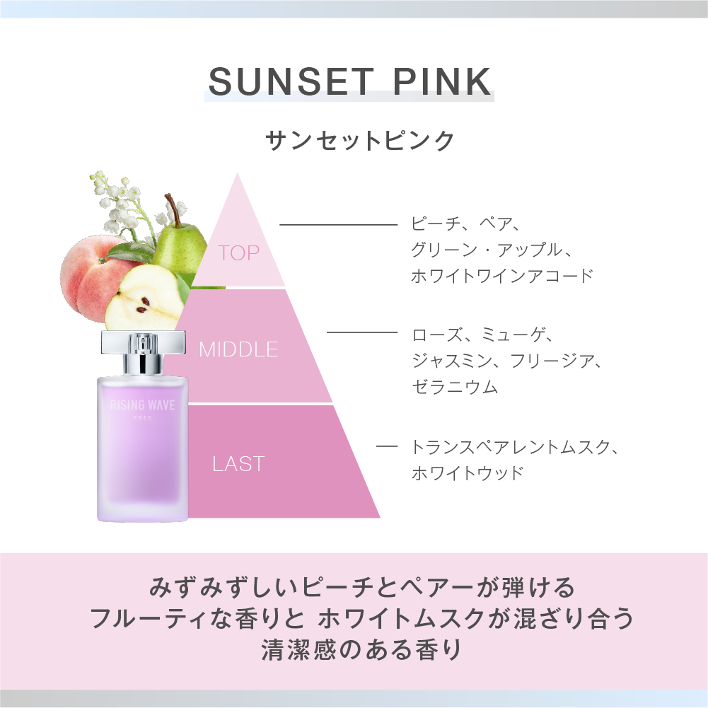 みずみずしいピーチとペアーが弾ける、フルーティーな香りとホワイトムスクが混ざり合う清潔感のある香りを、ふんわりとやさしく纏うことができます。また “サンセットピンク” のオードトワレをお使いの方は、柔軟剤とあわせてご使用いただくことで、香りに統一感が生まれ、より洗練された印象になります。