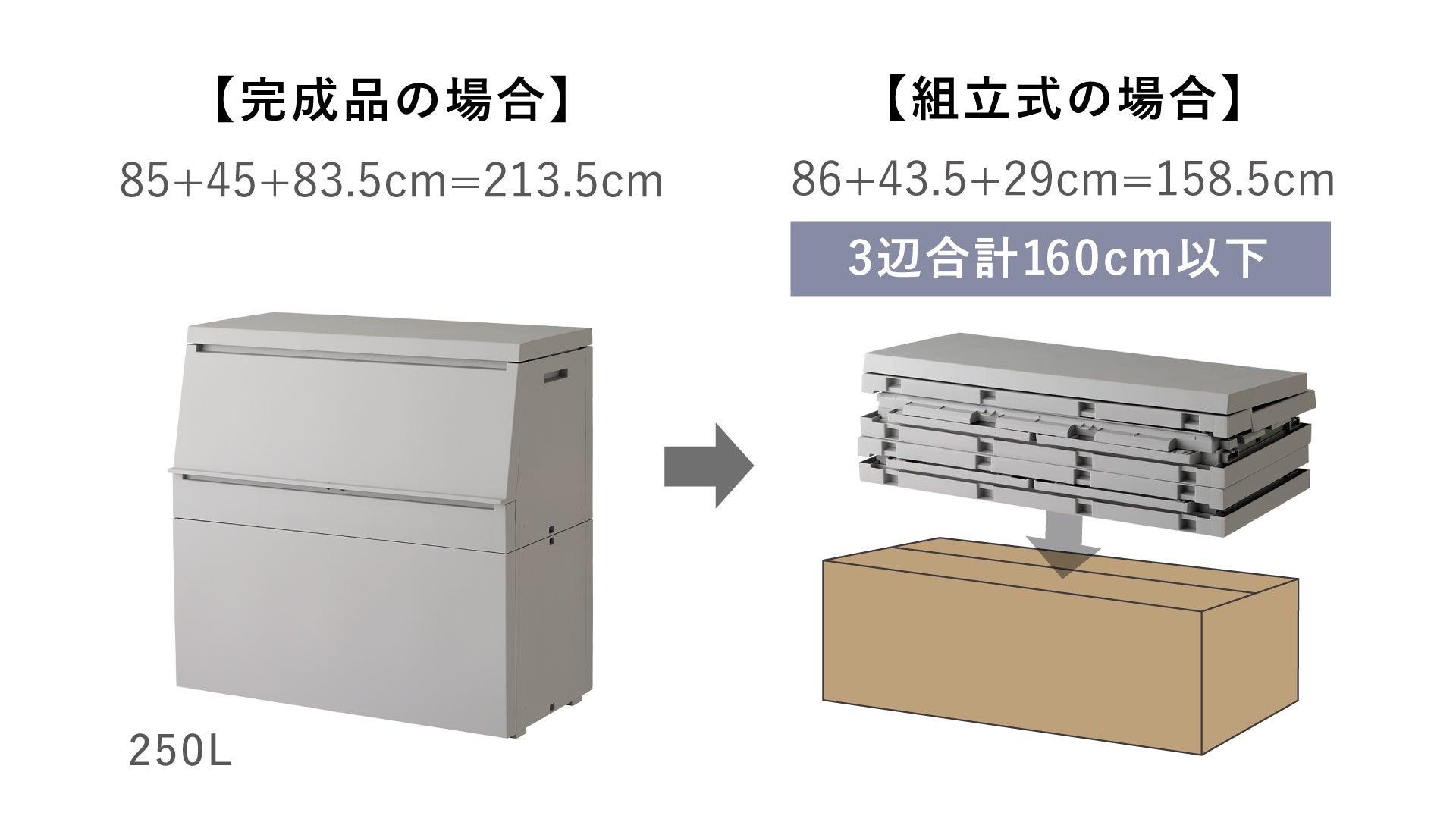 組み立て式フラットパックで、輸送費負担を軽減。3辺合計を160cm以下にすることで、輸送費と輸送によるCO2排出量を抑えることができます。