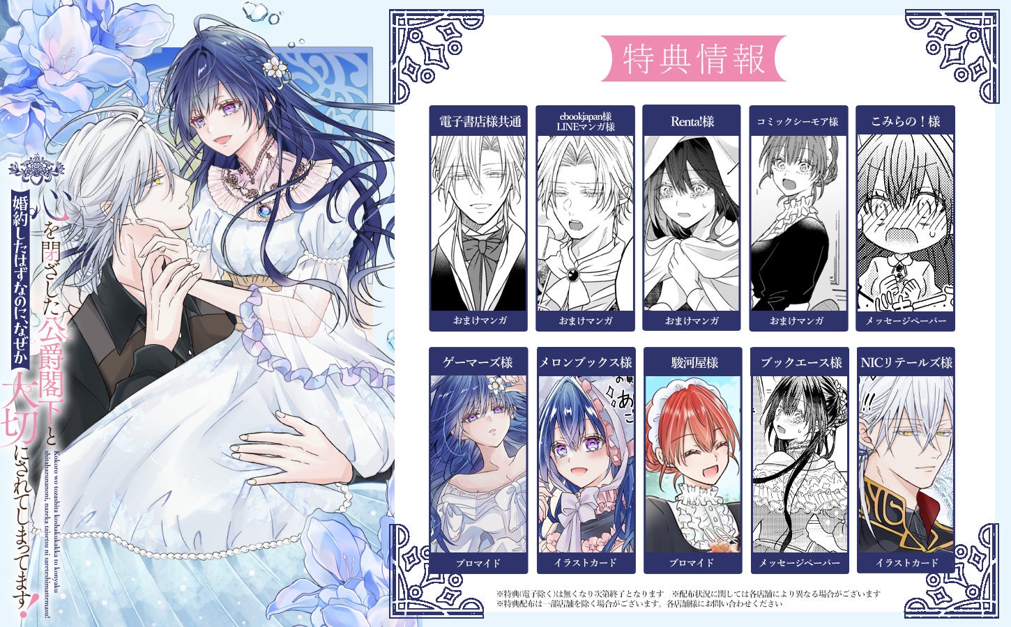 法人別特典にくわえて、一部対象書店では『心を閉ざした公爵閣下と婚約したはずなのに、なぜか大切にされてしまってます! 1~3巻』『死に戻りの伯爵夫人は自由に生きることにした~もしかして夫に溺愛されてました?~ 1巻』『真面目系天然令嬢は年下王子の想いに気づかない 1~3巻』を対象としたフェアも実施しております。