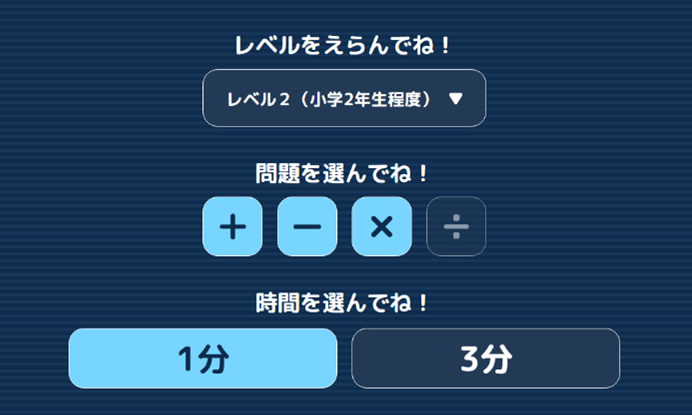 ○ 出題レベルは、小学校1年生程度から小学校6年生程度までの6段階から選べます。