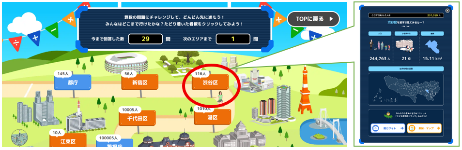 ○ チェックポイントの看板をクリックすると、各区市町村の人口や面積、小学校の数などの情報が表