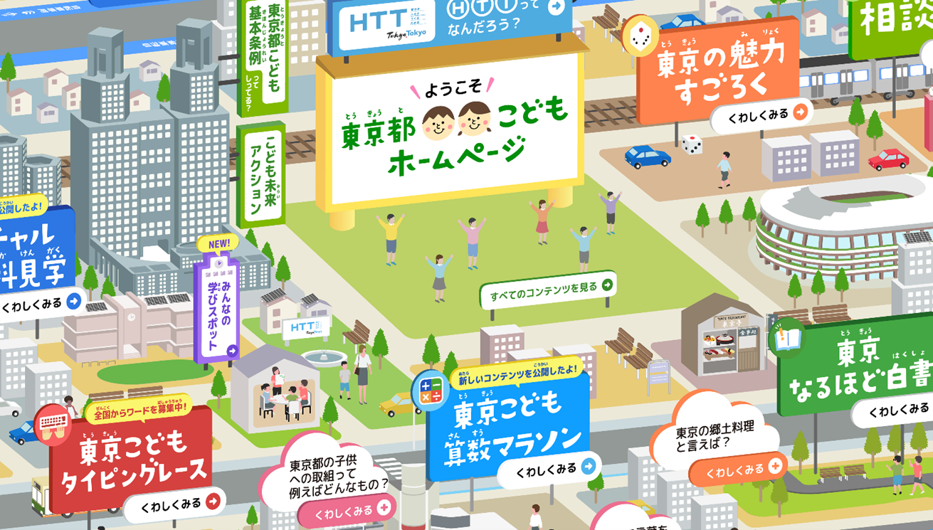 「東京都こどもホームページ」は、子供たちに楽しみながら東京の魅力や都政への関心を高めてもらうため、制作過程に子供たちが参加し、子供たちと一緒に作ったホームページです。