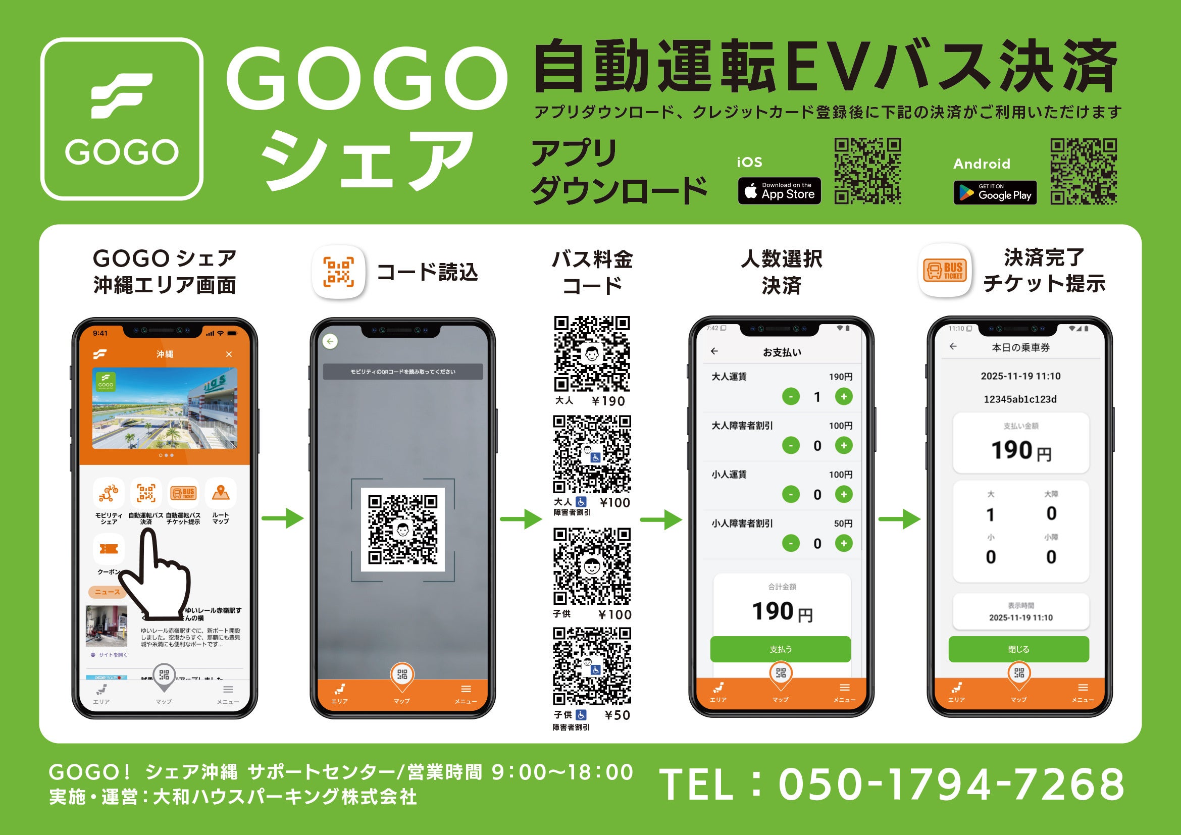 利用方法 : 「GOGO!シェア」アプリで事前にチケットを購入、または乗車時にバス車内のコードをアプリで読み込む