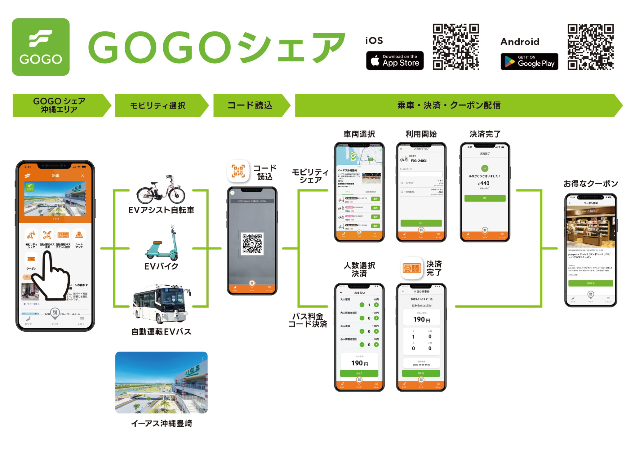 これにより、1つのアプリでEVアシスト自転車、EVバイクに加え、自動運転EVバスをシームレスに利用することができ「イーアス沖縄豊崎」をモビリティハブとする複数事業者間の交通連携を実現し、地域公共交通の課題解決を目指します。