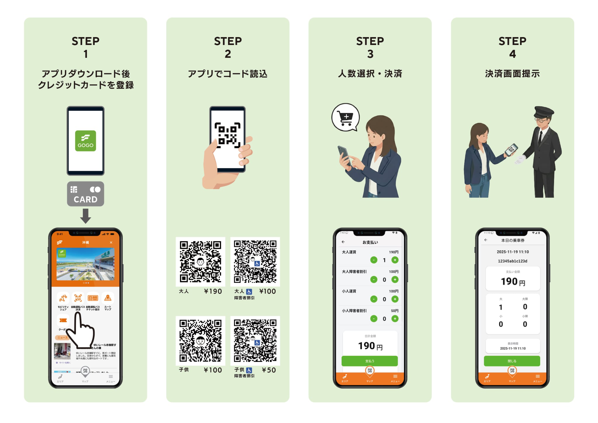自動運転EVバス利用者は、「沖縄GOGO!シェア」アプリをダウンロードし、クレジットカード登録の上、キャッシュレスコードを読み込んで決済することができます。