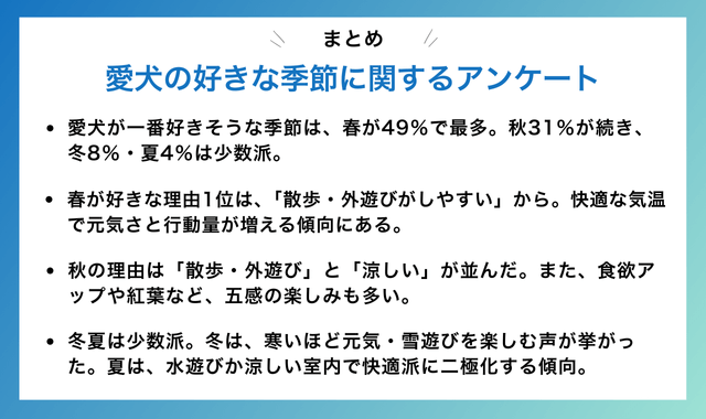 今回の結果から、愛犬の季節の好みは「気候や環境の刺激が引き出す“動きやすさ・遊びやすさ”」と強く結びついている傾向が見えてきました。