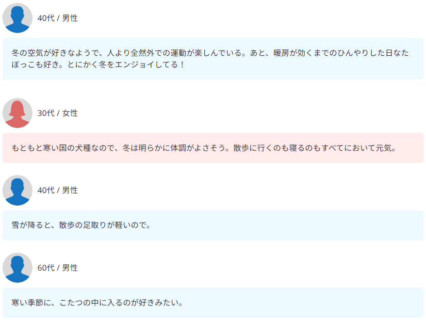 [画像8: https://prcdn.freetls.fastly.net/release_image/162349/44/162349-44-2b23a25f4525200e316f22e130a86a08-878x664.png?width=536&quality=85%2C75&format=jpeg&auto=webp&fit=bounds&bg-color=fff ]飼い主さんが「愛犬は冬が好き」と感じた主な理由は、「散歩や外遊びの様子が楽しそう」「寒くなると動きが軽くなり元気に見える」といった実感でした。