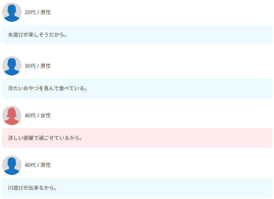 「水遊びや川辺レジャーを喜んでいる」というコメントがある一方、「冷たいおやつを嬉しそうに食べる」「涼しい室内にいると落ち着いて満足そう」といった、暑さ対策を軸に季節の良さを感じている視点も見られました。