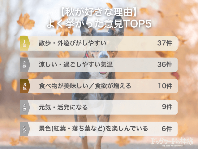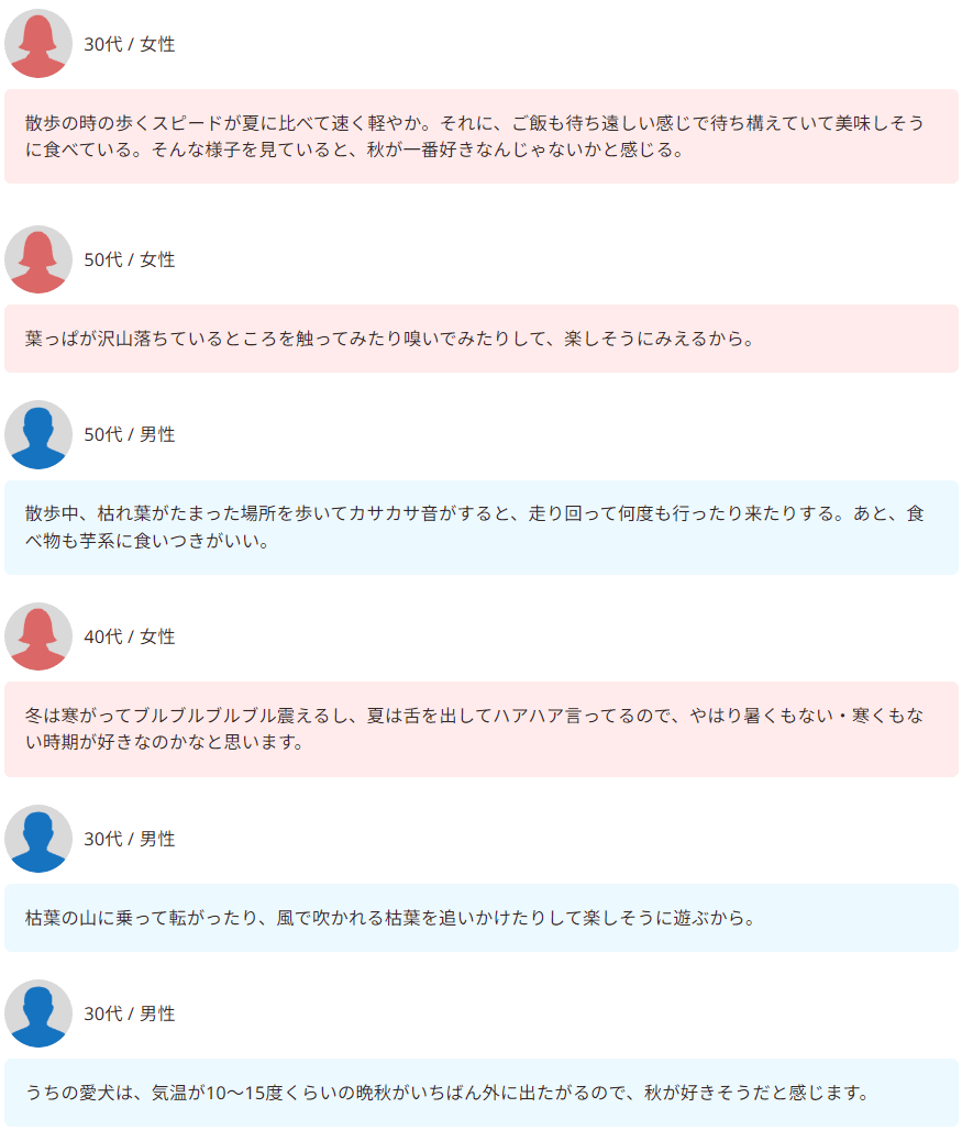 - 秋の理由は「散歩・外遊び」と「涼しい」が並んだ。また、食欲アップや紅葉、落葉など、五感の楽しみも多い。