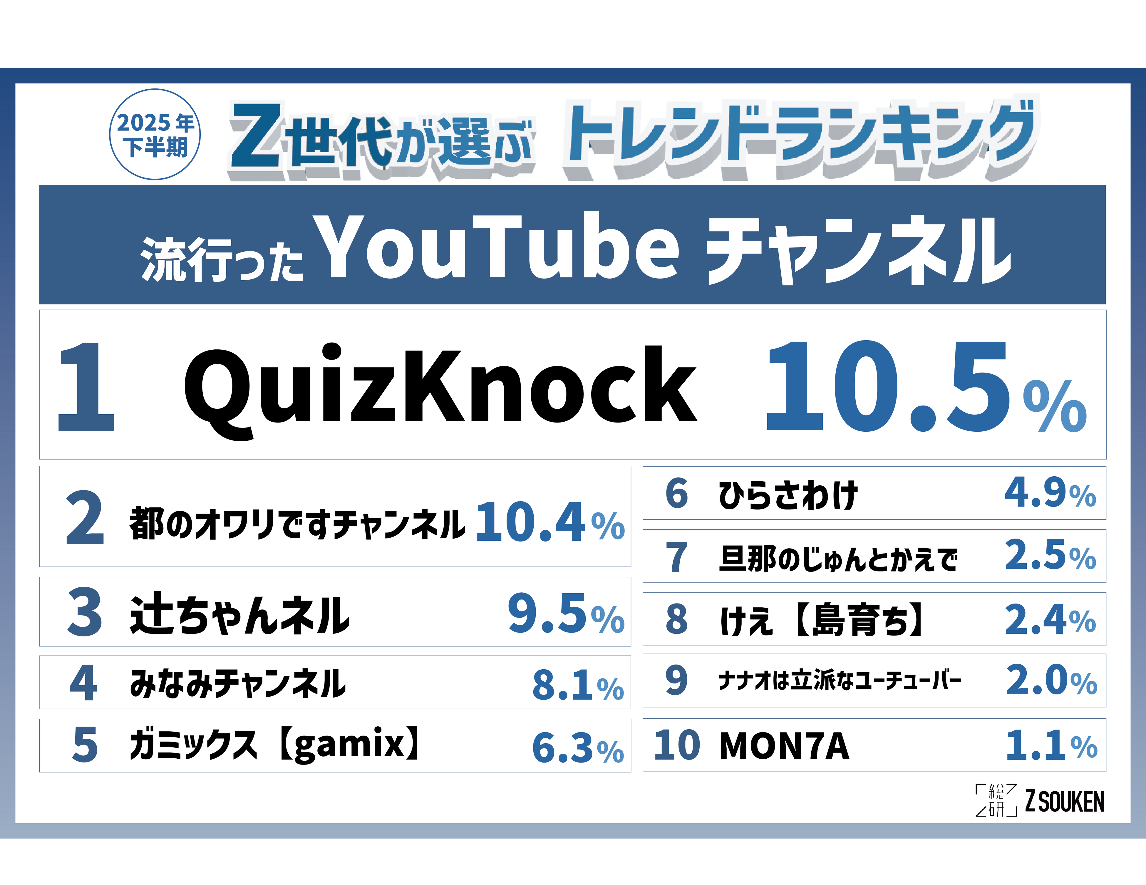 知的エンタメ集団の『QuizKnock』が急上昇1位に!今年で10周年を迎え、さらに注目を集める存在に!『都のオワリですチャンネル』や『ガミックス』などの単独YouTuberもランクイン!