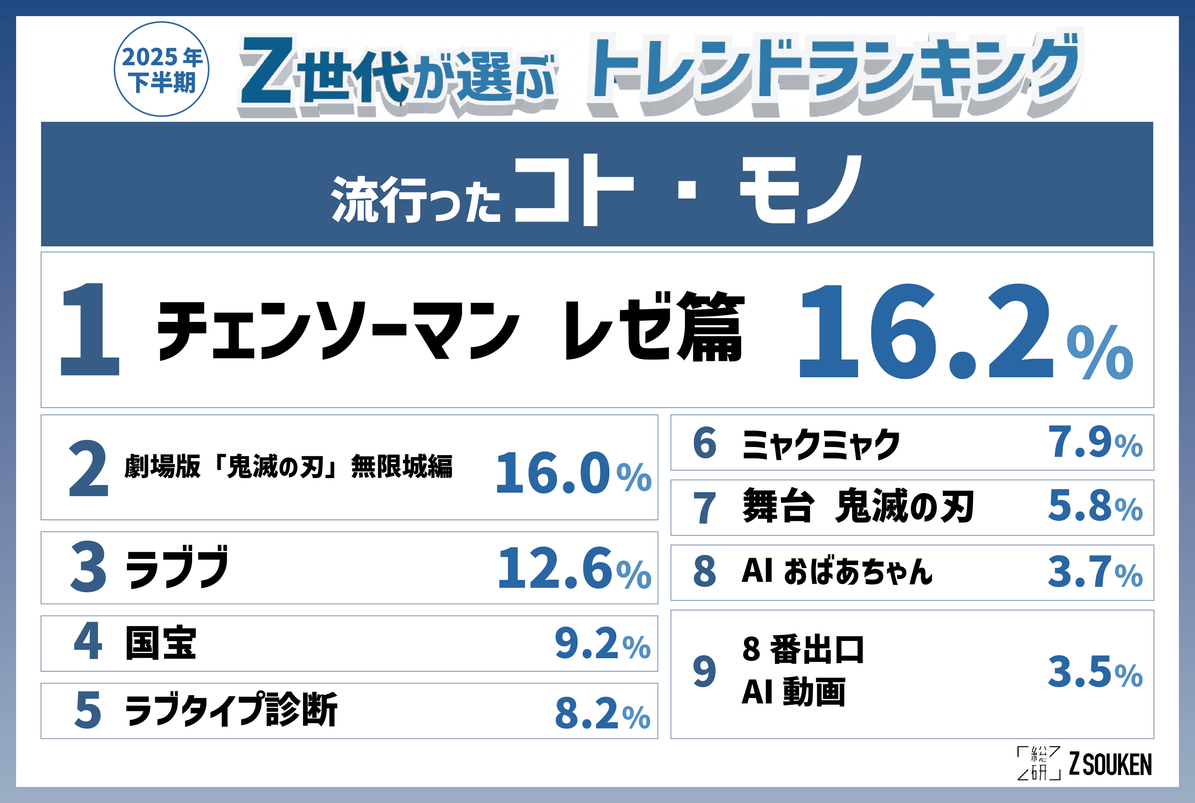 『チェンソーマン』や『鬼滅の刃』、『国宝』など話題の映画が上位にランクイン!その他、『ラブブ』や『ミャクミャク』など人気キャラクターに加えて、『AI』が今年はZ世代もトレンドに?!