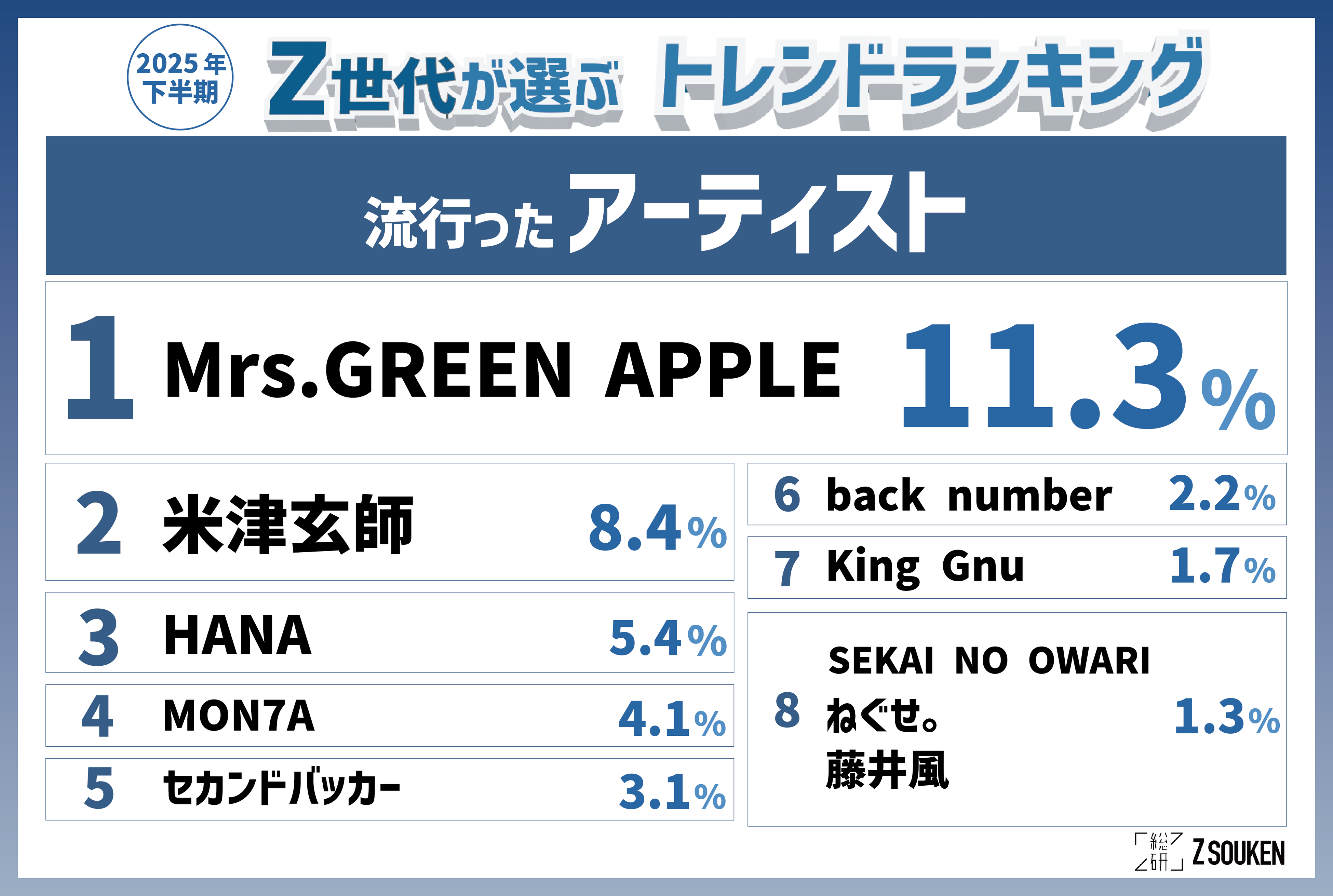 『Mrs. GREEN APPLE』が2023年下半期から連続1位で“Z世代の顔”に!「今日好き」で話題になった『MON7A』は“TikToker”と“アーティスト”の2部門でランクイン!