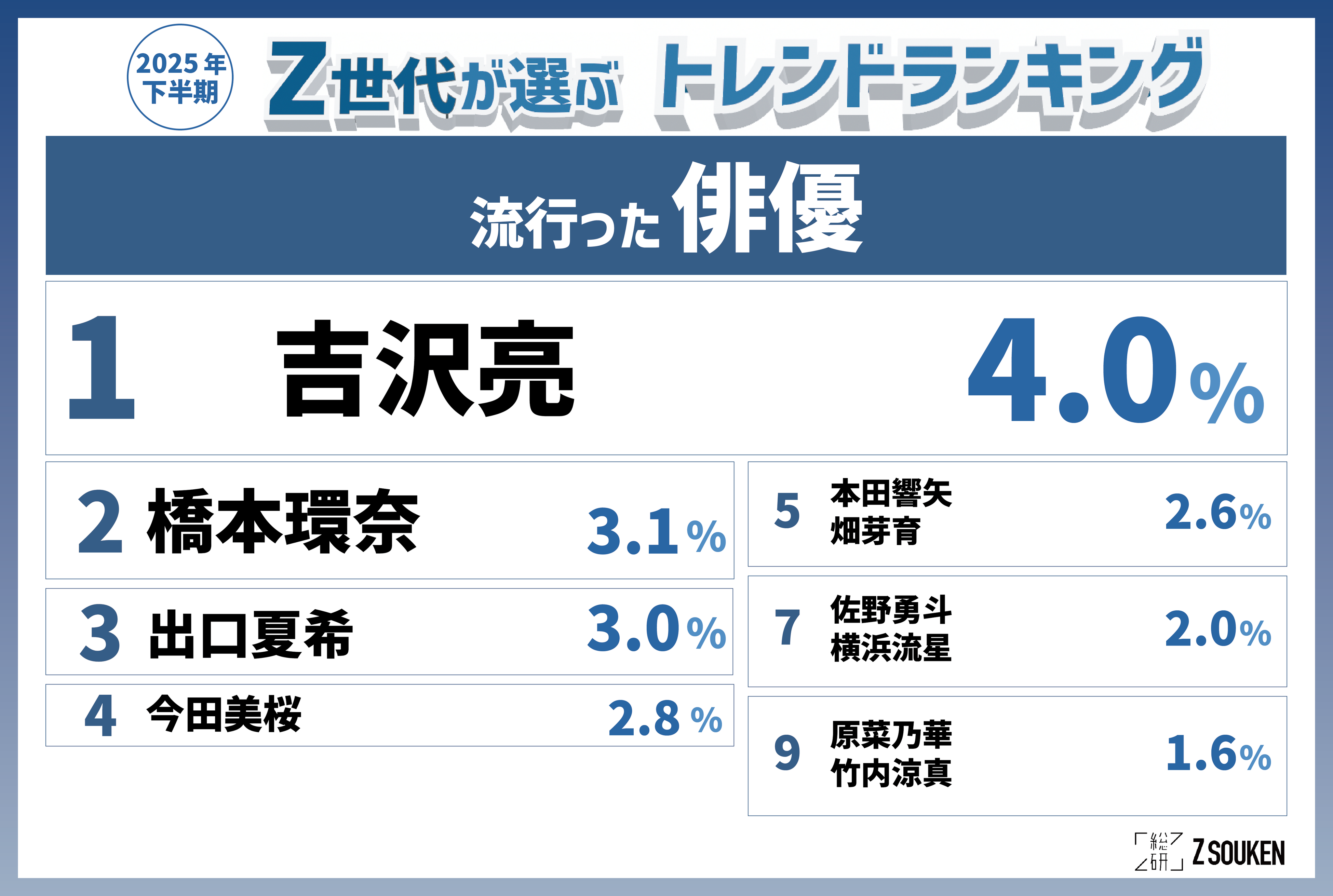 映画「国宝」で観客を魅了した実力派俳優『吉沢亮』が堂々の1位に!朝ドラで話題を集めた『橋本環奈』が2位、演技力で注目の『出口夏希』が3位と前回に続いて上位をキープ!